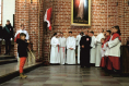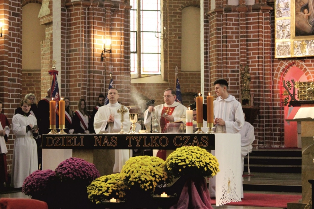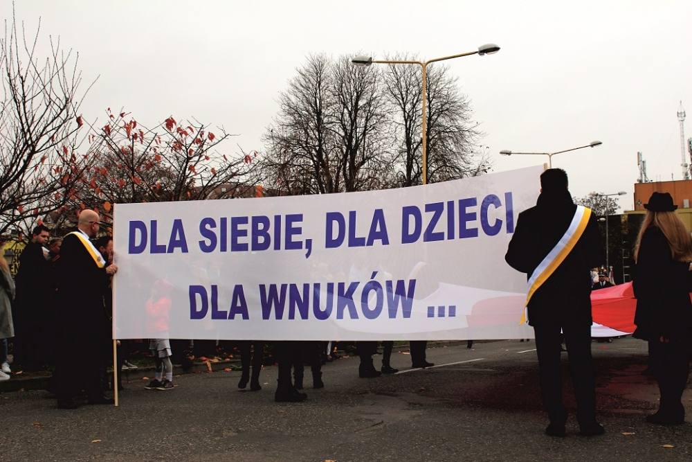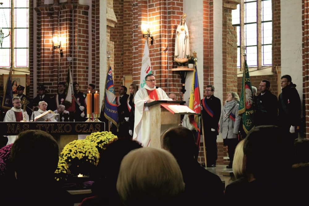 Pół godziny później rozpoczął się przemarsz ulicami miasta, prowadzony przez młodzież niosącą dziesięciometrową biało-czerwoną flagę, przyniesioną przez Rycerzy Kolumba. Tuż za młodymi maszerowały poczty sztandarowe, a na końcu mieszkańcy. Wszyscy zebrani udali się na Mszę św. w intencji Ojczyzny do kościoła pw. Wniebowzięcia Najświętszej Maryi Panny. Eucharystii przewodniczył dziekan - ks. Grzegorz Harasimiak, a homilię wygłosił specjalnie przybyły z tej okazji ks. Bogusław Burgat SChr - wikariusz generalny Towarzystwa Chrystusowego. Jeszcze przed liturgią, w łączności z całym krajem, wszyscy zebrani przy akompaniamencie organów odśpiewali hymn narodowy.