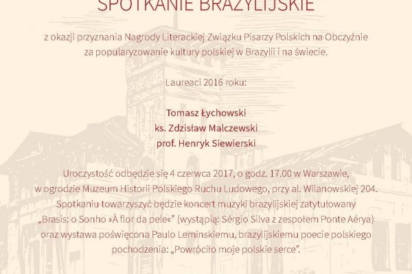 Związek Literatów Polskich na Obczyźnie przyznał w ubiegłym roku ks. dr. Zdzisławowi Malczewskiemu SChr nagrodę za popularyzowanie kultury polskiej w Brazylii i na świecie. Uroczysta gala wręczenia nagród, w której niestety nie mógł uczestniczyć laureat, odbyła się 4 czerwca 2017 roku w Warszawie.