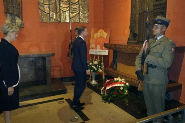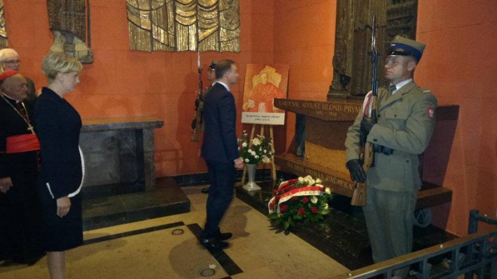 Po Mszy św. Prezydent Andrzej Duda, wraz ze swoją małżonką, zszedł do krypty archikatedry, gdzie złożył kwiaty na grobie prezydenta Gabriela Narutowicza, przed tablicą upamiętniającą prezydenta Stanisława Wojciechowskiego, na grobie prezydenta Ignacego Mościckiego oraz Prymasa Polski kard. Józefa Glempa. Następnie para prezydencka przeszła do kaplic, gdzie znajdują się sarkofagi dwóch wielkich Prymasów Polski: sługi Bożego kard. Stefana Wyszyńskiego i sługi Bożego kard. A. Hlonda. Tam również Pan Prezydent złożył wiązanki kwiatów.
