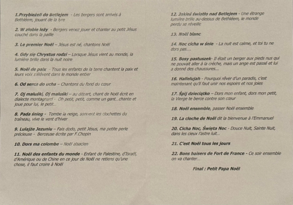 Szczególne miejsce w ich działalności zajmują koncerty kolęd, które od wielu lat odbywają się z okazji Świąt Bożego Narodzenia. Od dwóch lat organizowane są one bliżej samych świąt, a nie – jak dawniej – w późniejszym okresie bożonarodzeniowym. W tym roku chór „Melodia” zaprezentował repertuar kolęd w kościele Saint-Romain-sous-Gourdon w sobotę 13 grudnia 2025 r., natomiast chór „Polonia” wystąpił w niedzielne popołudnie 21 grudnia 2025 r. w kościele w Saint-Vallier.