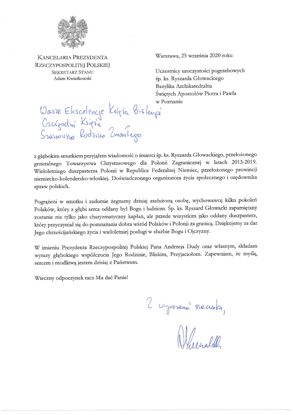 Kondolencje w imieniu Prezydenta RP Pana Andrzeja Dudy