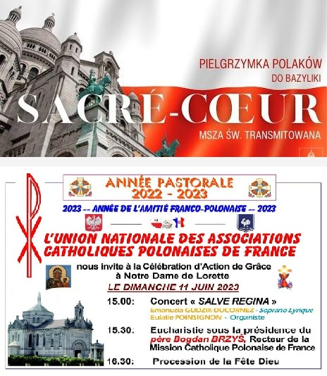 Polacy z regionu paryskiego udali się w piątek 9 czerwca 2023 r. z pielgrzymką na paryskie wzgórze Montmartre i do królującej nań bazyliki poświęconej czci Najświętszego Serca Pana Jezusa, gdzie wspólnemu dziękczynieniu przewodniczył bp Piotr Turzyński, Delegat KEP ds. Duszpasterstwa Emigracji Polskiej. Tymczasem Rodacy z Hauts-de-France zgromadzili się w uroczystość Bożego Ciała bazylice Notre-Dame de Lorette górującej pośród grobów żołnierzy poległych w czasie Wielkiej Wojny na Mszy Świętej połączonej z procesją eucharystyczną pod przewodnictwem ks. Bogusława Brzysia, Rektora PMK we Francji.