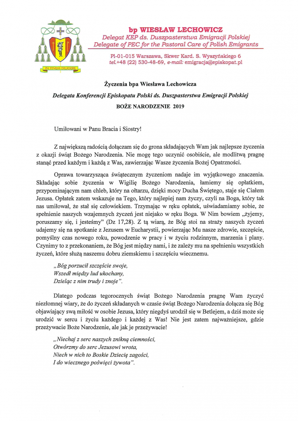 Z największą radością dołączam się do grona składających Wam jak najlepsze życzenia z okazji świąt Bożego Narodzenia. Nie mogę tego uczynić osobiście, ale modlitwą pragnę stanąć przed każdym i każdą z Was, zawierzając Wasze życzenia Bożej Opatrzności.