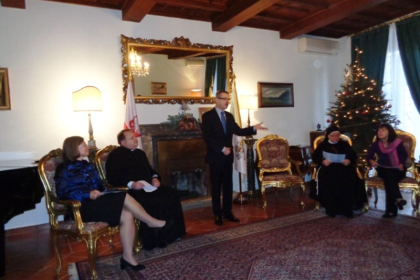 Dyrektor Szkoły Agata Rola-Bruni, dziękując gospodarzom za zaproszenie podkreśliła, że ma ono dla przybyłych wyjątkowe znaczenie. „Siedziba polskiej Ambasady jest wszakże skrawkiem Polski na włoskiej ziemi”. – „Nie tylko miejsce, ale i data naszego dzisiejszego spotkania jest szczególna – dodała. 154 lata temu, 22 stycznia, rozpoczęło się Powstanie Styczniowe, największy w historii polski zryw narodowy”.