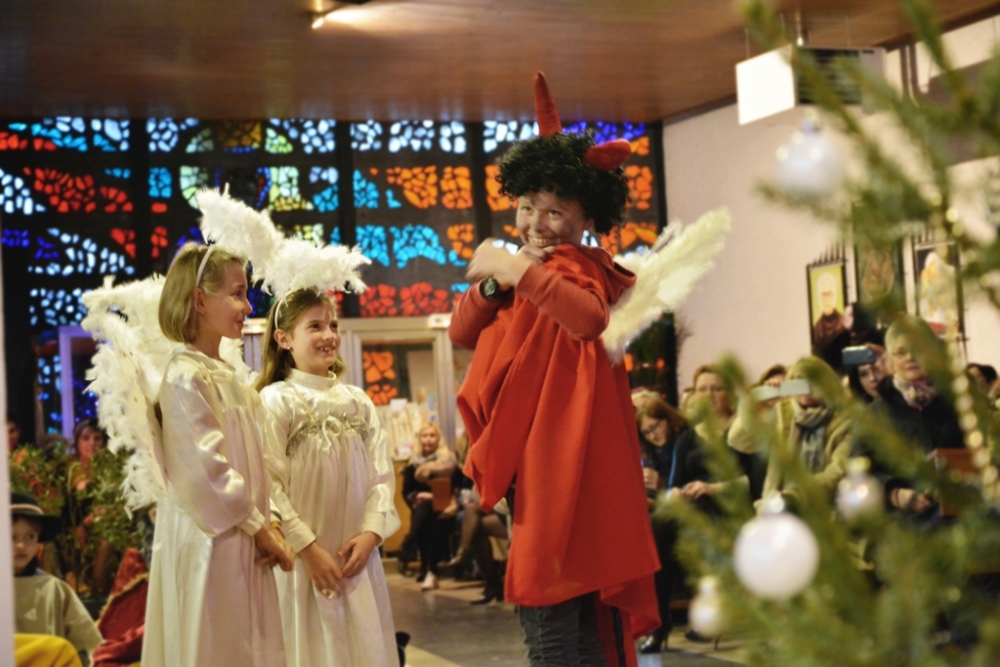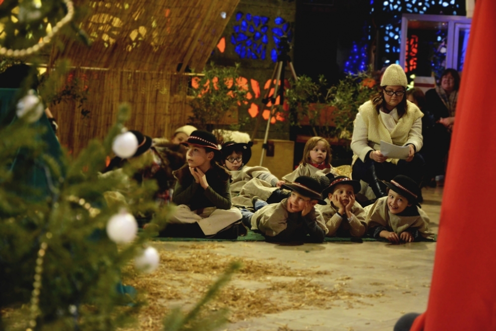 Rozpoczęły się one sceną «niebo», w której archaniołowie Michał Gabriel, Rafał postanawiły udać się do szopki, aby ją uszczelnić i wyczyścić zanim narodzi się Dzieciątko Jezus. Z pomocą chcieli pójść i malutkie aniołki, prosząc starszych o pozwolenie na podroż. Niestety w dalekiej drodze do Betlejem aniołki zagubiły się i znalazły się w strefie niczyjej, gdzie znajdowało się «piekło». Tam na szczęście spotkały dobrego diabełka Rokitę, który pokazał im drogę. I aniołki doleciały bezpiecznie do szopki. Przybyli tam również Maryja, Józef, pasterze, honorowi goście – mędrcy świata, którzy oddali pokłony i złożyli dary małemu Dzieciątku. Całość przedstawienia była przeplatana kolędami i pastorałkami w wykonaniu dzieci i naszych muzyków. Zabawną i śmieszną puentę przedstawienia stanowił moment, w którym, w nagrodę za okazaną dobroć, diabeł Rokita otrzymał anielskie białe skrzydła i stał się aniołem. Na zakończenie jasełek głos zabrali organizator, Mateusz Pastwa, ks. Ryszard, którzy podziękowali dzieciom, rodzicom oraz tym co zadbali o uszycie kostiumów i przygotowali dekoracje i rekwizyty: szopkę z scenami (nieba i piekła). Wszystkie dzieci, oraz dzieci, które brały udział w jasełkach (w sumie około 50) otrzymały od naszego księdza proboszcza paczki ze słodyczami.