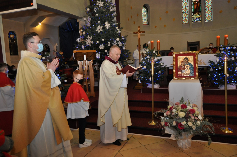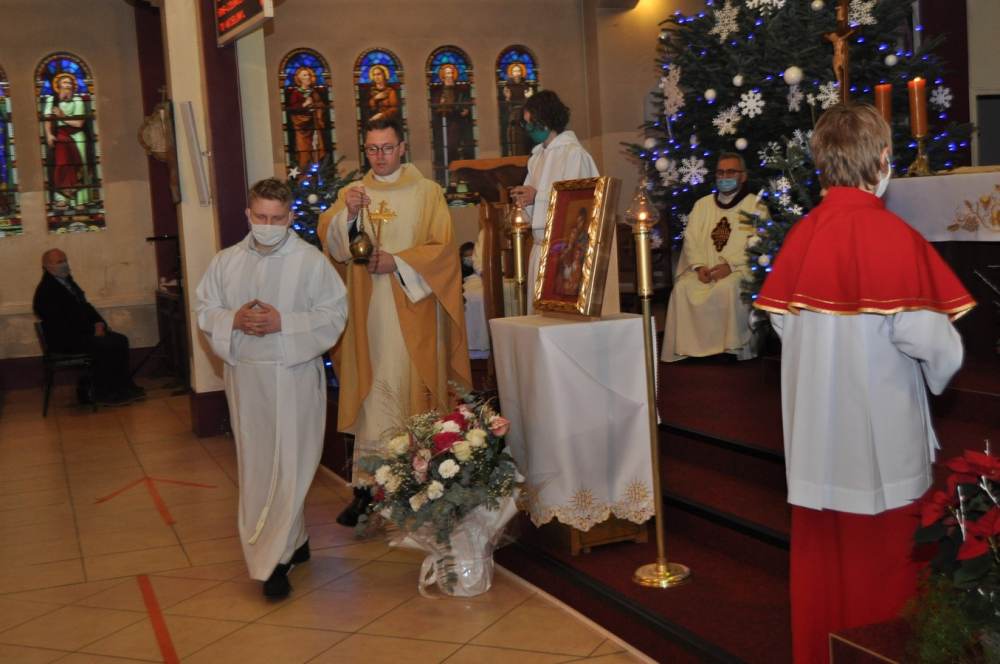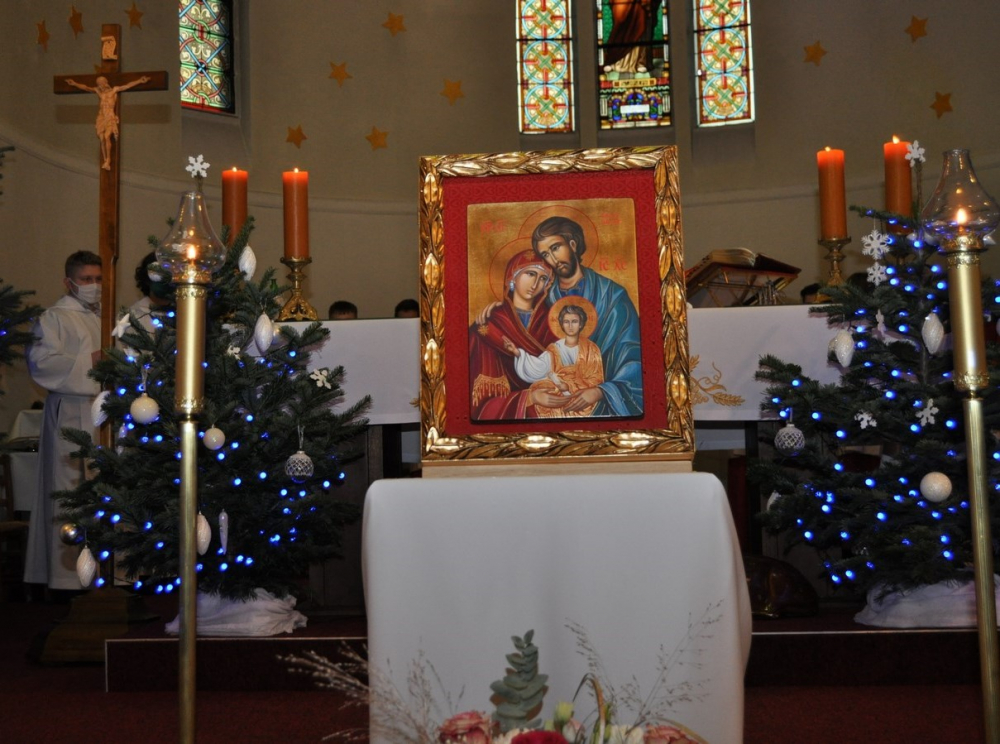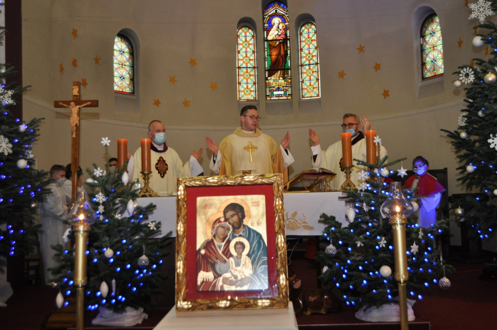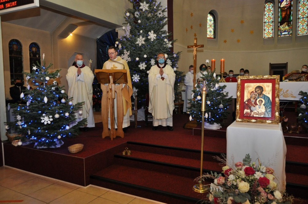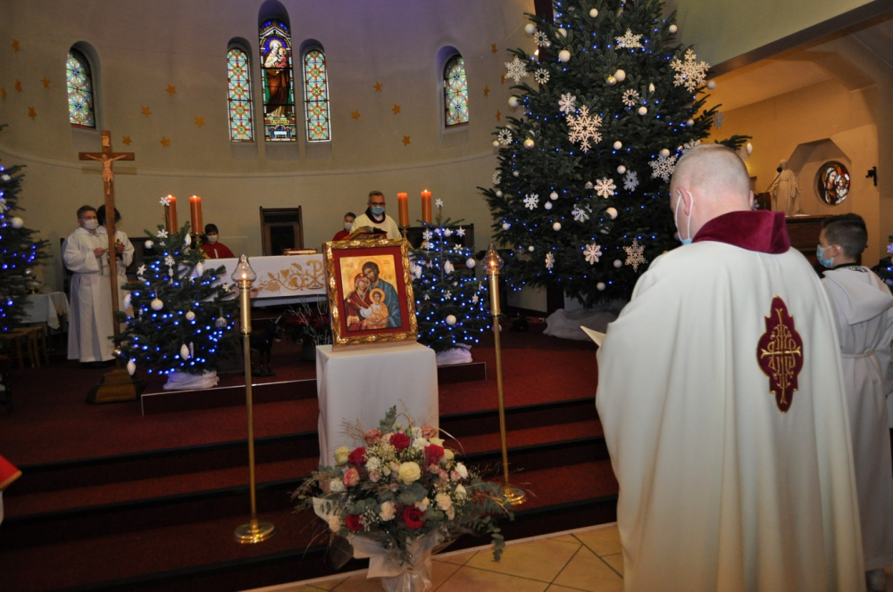 Msza Święta miała charakter bardzo uroczysty, pomimo spowodowanej pandemią obostrzeniami sanitarnymi ograniczonej liczby wiernych. Po procesyjnym wprowadzeniu ikony ksiądz prowincjał Zbigniew Wcisło SChr dokonał jej poświęcenia. Liturgii przewodniczył ks. proboszcz Jarosław Koch SChr, a Słowo Boże wygłosił gość z Polski, ks. Wiesław Wójcik SChr. Na zakończenie Mszy zwierzyliśmy siebie i naszą parafię opiece Świętej Rodziny. Tą uroczystością rozpoczęliśmy peregrynację ikony Świętej Rodziny po naszych domach.