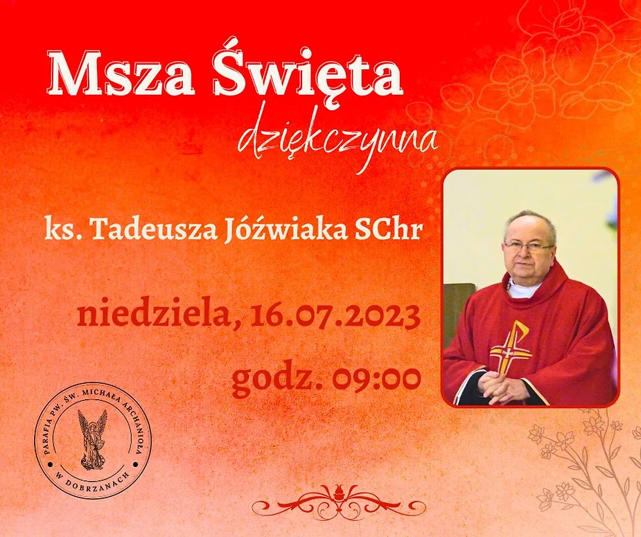 W niedzielę, 16 lipca 2023 r., o godz. 9.00 w kościele parafialnym pw. św. Michała Archanioła w Dobrzanach została odprawiona Msza św. dziękczynna w intencji ks. Tadeusza Jóźwiaka SChr. Decyzją przełożonych zakonnych z dniem 15 lipca br. został on skierowany do Domu Chrystusowca-Seniora w Puszczykowie.