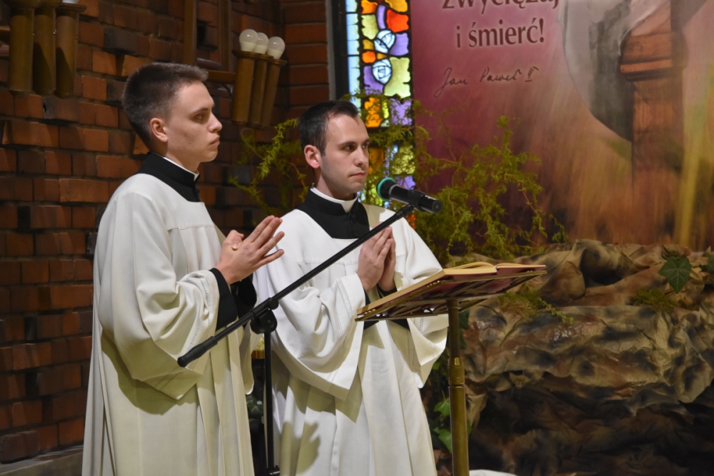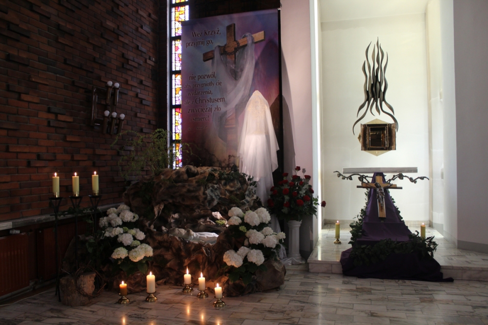 Po zakończonej liturgii zaśpiewaliśmy trzy części Gorzkich Żali i podjęliśmy całonocne czuwanie adoracyjne przed wystawionym w monstrancji Chrystusem Eucharystycznym w pięknie przygotowanym tzw. „Bożym Grobie”. Ważnym elementem naszej modlitwy w tych świętych dniach było wspólne sprawowanie liturgii godzin, szczególnie jutrzni połączonej z godziną czytań (stanowiącym poniekąd nawiązanie do odprawianych według starej tradycji w tym czasie tzw. „ciemnych jutrzni”). Wspólnie odmówienie nieszporów Wielkiej Soboty (jedynych w roku kościelnym nieszporów sobotnich) zakończyło adorację Najświętszego Sakramentu.