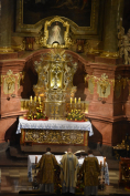 Ks. Generał przewodniczył wieczornej koncelebrowanej Eucharystii w dniu naszej pielgrzymki – we wtorek 8 października 2019 r. a okolicznościową homilię wygłosił ks. Paweł Jasina SChr, prefekt seminarium. Była ono słowem pocieszenia, pokrzepienia i nadziei a jednocześnie osobistym świadectwem, ponieważ homilista odwoływał się do czasów swojej seminaryjnej formacji – do pielgrzymek do Fary, gdzie Maryja w obrazie Matki nam gotowej nieustannie pomagać zajmuje szczególne miejsce – między ołtarzem a Kaplicą Wieczystej Adoracji. Albowiem Maryja nieustannie wskazuje na swojego Syna i do Niego prowadzi, co powtarzamy w głoszonych homiliach i kazaniach, jak mówił ks. Paweł, rokrocznie przy okazji uroczystości odpustowej. Przybywający do tej świątyni chyba spontanicznie kierują się od wejścia na prawo, by stanąć naprzeciw Maryi, swojej Matki i Królowej, by kolejny raz wziąć do serca tę prawdę, iż należy słuchać Boga i stawać się Jego świadkami, stawać się znakiem Jego obecności i działania dla mieszkańców Poznania. Do tego powołane są zwłaszcza osoby konsekrowane: powołane, by tak jak prorok Jonasz wstać, iść i głosić; powołane, by tak jak Marta przez swoją aktywność ukazywać miłość Boga do człowieka i jak Maria przycupnąć u stóp Pana i kontemplować Jego Słowo, adorować Jego eucharystyczną obecność, czerpać siły do apostolstwa. Jest to potrzebne, bo nie możemy, przywołując papieża-seniora, pozwolić, by Bóg był marginalizowany: bo świat pozbawiony Boga staje się światem bez znaczenia, światem bez sensu. Jezus bowiem przychodzi, by dać życie, by wypełnić wszelakie pustki swoją miłością, by nas wspomagać… Umocnieni tym krzepiącymi myślami prosimy Maryję, by pomagała nam słuchać Pana i wypełniać Jego słowo na co dzień…