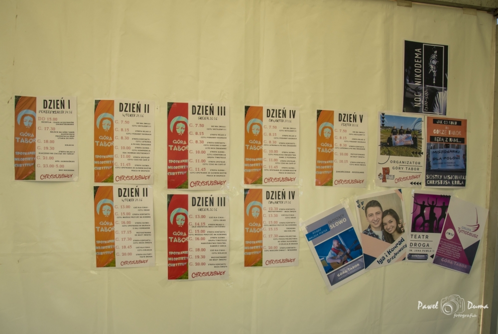 Całość imprezy odbywała się w specjalnie przygotowanych strefach: Słowa, Kontaktu, Wielbienia, Spotkań, Relax-u, Pielgrzyma, Miłosierdzia i Kultury. Centrum każdego dnia była Eucharystia, podczas której Słowo głosił od lat związany z Górą Tabor ks. Waldemar Piątek z Nowogardu.