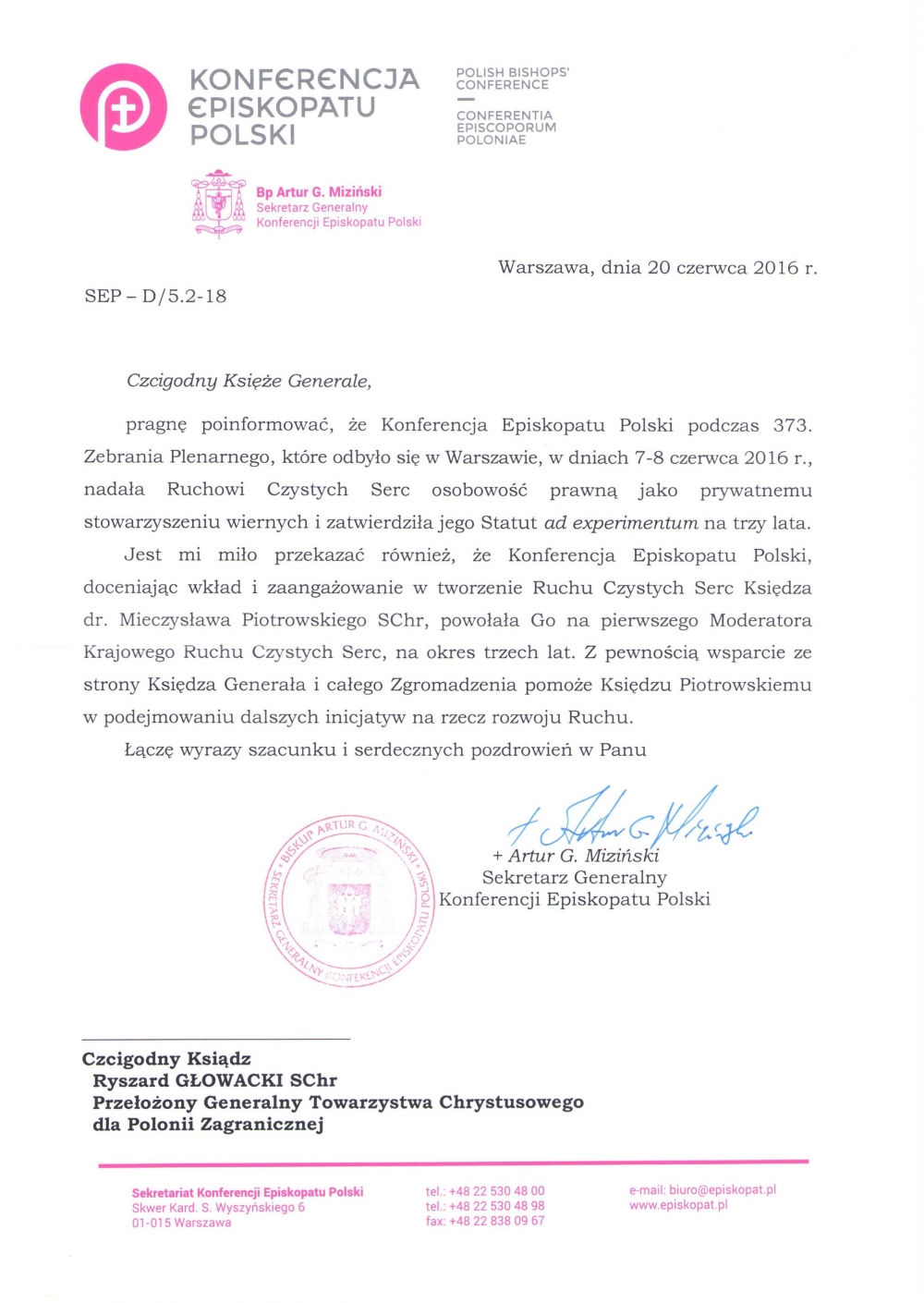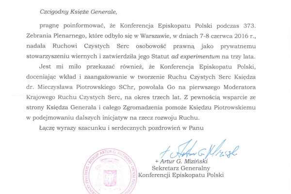 Konferencja Episkopatu Polski podczas 373. Zebrania Plenarnego, które odbyło się w Warszawie, w dniach 7-8 czerwca 2016 r., nadała Ruchowi Czystych Serc osobowość prawną jako prywatnemu stowarzyszeniu wiernych i zatwierdziła jego Statut ad experimentum na trzy lata.