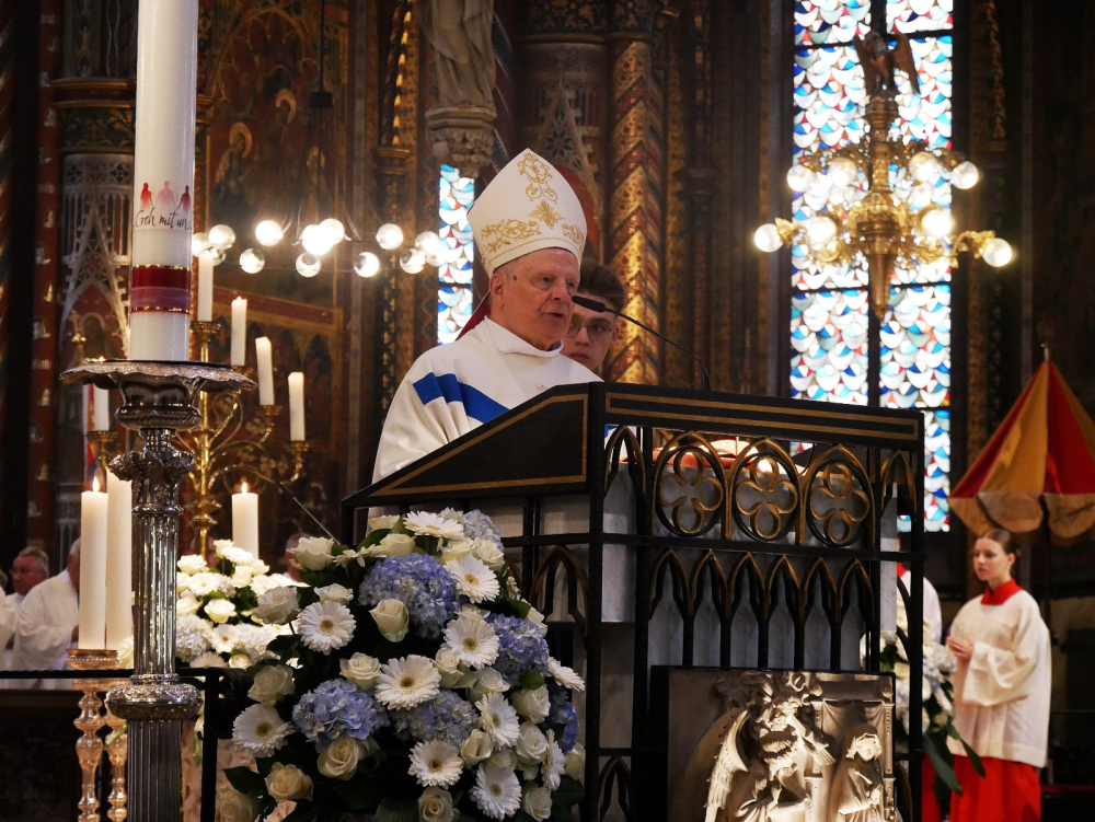 W homilii podkreślił ogromną rolę i zatroskanie Matki Bożej o naród polski w różnych wydarzeniach jego historii, zaznaczając, że w tych różnorakich wydarzeniach staraliśmy się naśladować św. Jana: brać Ją do siebie, które dokonywało się i dokonuje przez pielęgnowanie i odprawianie nabożeństw majowych, październikowych, pięknych uroczystości maryjnych. Jednocześnie przypominał, że jest jedynie jeden ważny moment decydujący, czy nasza pobożność maryjna jest naprawdę miła Panu Bogu. Jest jedno jedyne kryterium: gdy spełniamy jedyne życzenie Matki Bożej, która i nam powtarza te same słowa wypowiedziane niegdyś do sług w Kanie Galilejskiej, „Czyńcie to, co On, mój Syn wam powie”. Homilista dodał, że Chrystus mówi przez Ewangelię, przez nauczanie Kościoła, a także przez różne wydarzenia, że podczas naszej życiowej drogi pełnej pytań, bolesnych rozczarowań, niepokojów, dołącza się Boski Wędrowiec i nam towarzyszy. Przywołując tę ewangeliczną scenę z uczniami idącymi do Emaus, podkreślał, aby w nas budziło się pragnienie, by zawołać jak oni Panie, pozostań z nami! Albowiem ta perykopa ewangelijna scena wraz ze słowami „Geh mit uns – Idź z nami” stanowi motto pielgrzymowania do sanktuarium w Kevelaer w roku 2024-2025.