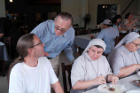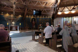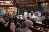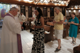 Po obiedzie kontynuowano zjazd w kościele Świętych Apostołów Piotra i Pawła. Ks. Kazimierz Długosz SChr, miejscowy proboszcz, a zarazem ekonom prowincji Towarzystwa Chrystusowego i organizator spotkania tym razem już oficjalnie przywitał przybyłych, dziękując bpowi Piotrowskiemu za troskę o misjonarzy, która wyraża się nie tylko w odwiedzinach, ale w stale udzielanej pomocy posługującym na misjach. Ostatnio doświadczyli jej m. in. marianie, którzy nie mogąc przybyć, wdzięczność wyrazili przez pośrednictwo ks. Kazimierza Długosz SChr. Osobiście zaś podziękował nasz Współbrat, ks. Zdzisław Malczewski SChr, Rektor Polskiej Misji Katolickiej w Brazylii: otrzymał on bowiem środki potrzebne do odbudowy zniszczonego przez ubiegłoroczną powódź kościoła w Porto Alegre. Następnie ks. Długosz w kilku słowach przedstawił historię parafii, w której duszpasterstwo od jej początków prowadzą chrystusowcy. Obecni mogli podziwiać wspaniale wnętrze kościoła oraz umieszczone w nim symbole, także te, które wskazują na wdzięczność parafian za posługę braci i kapłanów Towarzystwa Chrystusowego. Natomiast przy okazji nakreślania pracy w Brazylii przedstawicieli różnych zgromadzeń zakonnych, wskazał, że w południowoamerykańskiej prowincji chrystusowców posługiwało pięciu księży pochodzących z diecezji, w której pasterzem jest Ksiądz Biskup. Przemówienie gospodarza było też okazją przedstawienia obecnych misjonarzy, którzy, na jego prośbę, podzielili się historią swojego duszpasterzowania na Ziemi Krzyża Południa.