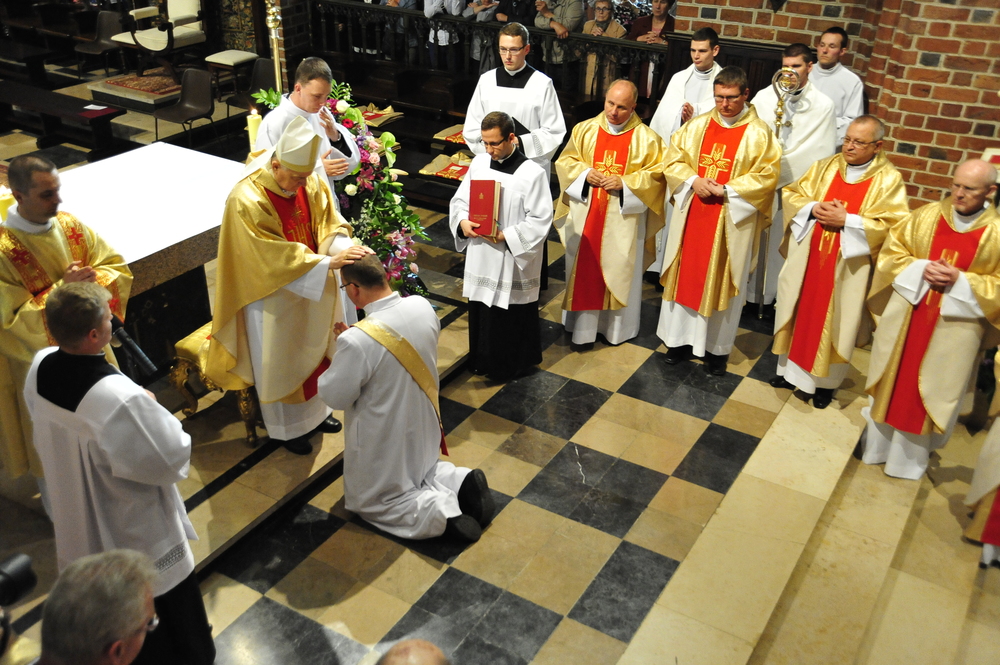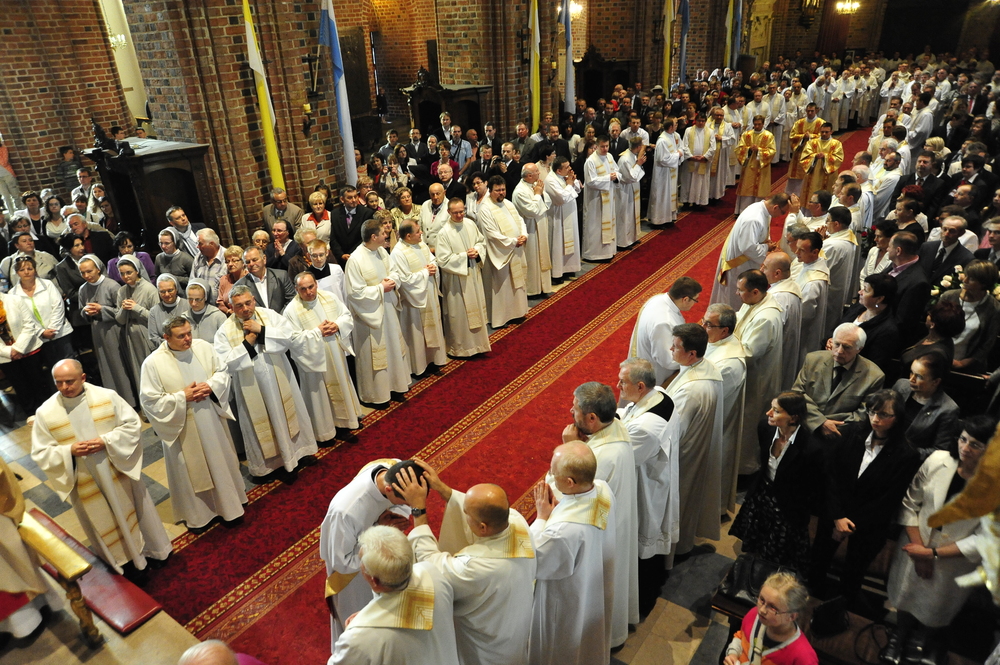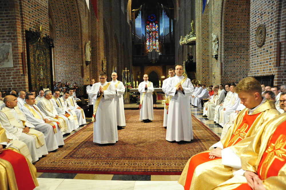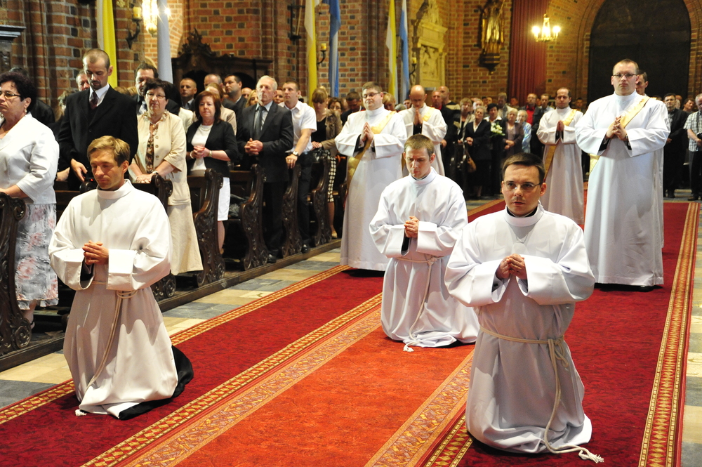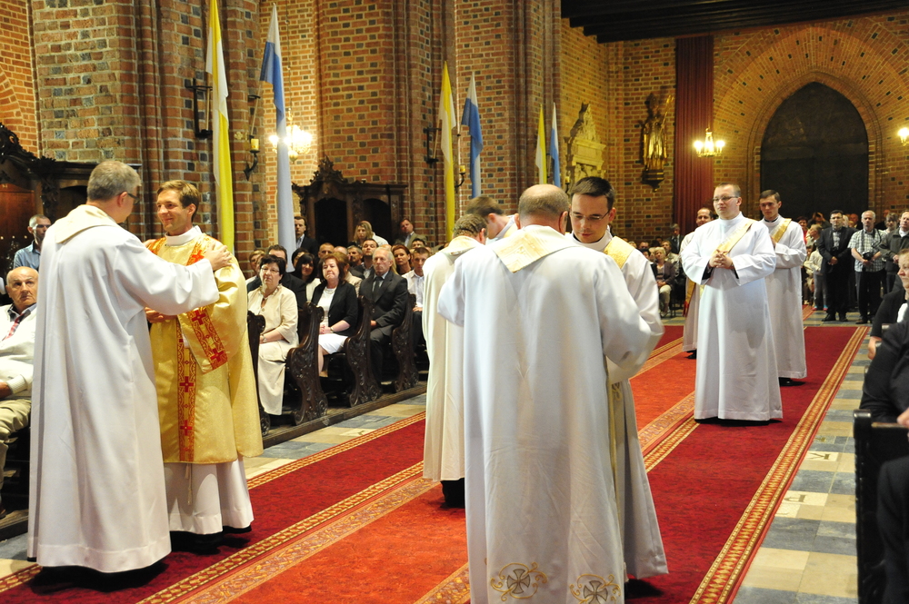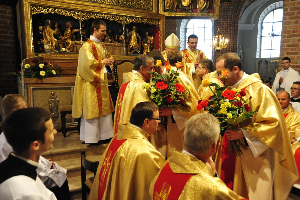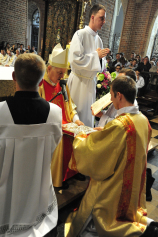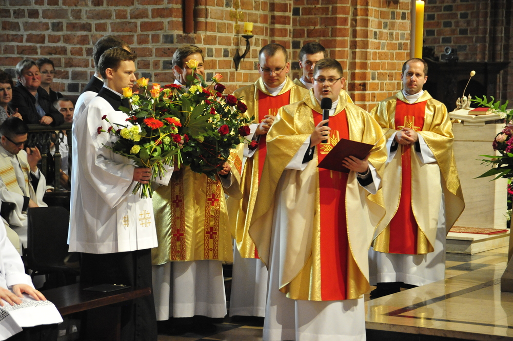 „Dzień święceń prezbiteratu i diakonatu każdego roku jest punktem kulminacyjnym dla naszej wspólnoty zakonnej – Towarzystwa Chrystusowego dla Polonii Zagranicznej. Wydarzeniem świętym, pięknym wspólnym duchowym owocem: owocem działania Pana Boga, który wybiera, powołuje i kształtuje nowych szafarzy łaski; owocem odpowiedzi i niełatwego wysiłku powołanego – w rozeznaniu i rozwinięciu swojego powołania; owocem procesu formacji w ramach wspólnoty zakonnej, kształtującej wiarę i charyzmat powołanego; owocem miłości rodziców, rodziny i przyjaciół podtrzymujących i wspierających swego syna, wnuka, brata, kolegę” – tak mówił dzisiaj (wtorek, 21.05.2013) rektor Wyższego Seminarium Duchownego naszego zgromadzenia ks. Bogusław Burgat we wprowadzeniu do uroczystej Mszy Świętej połączonej z udzieleniem święceń prezbiteratu pięciu diakonom i świeceń diakonatu trzem akolitom naszego zgromadzenia. Eucharystia rozpoczęła się o godz. 10.00 w bazylice archikatedralnej w Poznaniu pod przewodnictwem ks. bpa Grzegorza Balcerka – biskupa pomocniczego archidiecezji poznańskiej. Mszę koncelebrowali przełożeni Towarzystwa Chrystusowego z księdzem generałem Tomaszem Sielickim na czele, prowincjałowie Towarzystwa z Australii, Francji, Stanów Zjednoczonych i Wielkiej Brytanii, rektor PWT w Warszawie, wychowawcy seminaryjni, wielu współbraci chrystusowców z różnych stron świata oraz zaprzyjaźnieni kapłani diecezjalni i zakonni. W sumie ponad 100 kapłanów. Wyświęcanych diakonów i prezbiterów modlitwą i życzliwością otaczali także rodzice, krewni i przyjaciele, siostry zakonne, bracia, nowicjusze i klerycy Towarzystwa Chrystusowego. W homilii bp Balcerek nawiązał do szczególnego miejsca, jakim jest poznańska katedra, gdzie pochowani są pierwsi władcy Polski – Mieszko I i Bolesław Chrobry i gdzie niejako rodziła się polska państwowość i organizacja Kościoła na ziemiach piastowskich. Do młodych chrystusowców, którzy dziś wyświęceni za kilka lat wyjadą do pracy wśród Polonii na całym świecie i wszystkich innych, którzy już wśród Polonii pracują Biskup mówił, aby tę polskość i katolicką wiarę nieśli wszędzie tam, gdzie ich Bóg pośle, aby tej wiary i polskości się nie wstydzili.