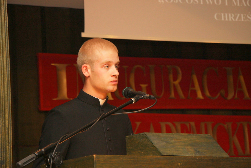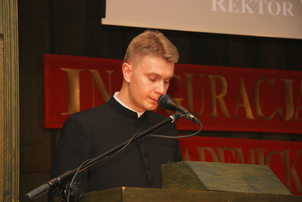 Kolejnym punktem programu była immatrykulacja dziewięciu alumnów I roku studiów. Po uroczystym ślubowaniu klerycy otrzymali indeksy z rąk ks. prof. dra hab. Zbigniewa Kubackiego – rektora PWTW, do którego afiliowane jest nasze seminarium. Zanim zabrzmiało radosne Gaudeamus igitur… Vivat Academia, Vivat professores przemówił przedstawiciel studentów, dziekan seminarium kl. Damian Jędrzejak.