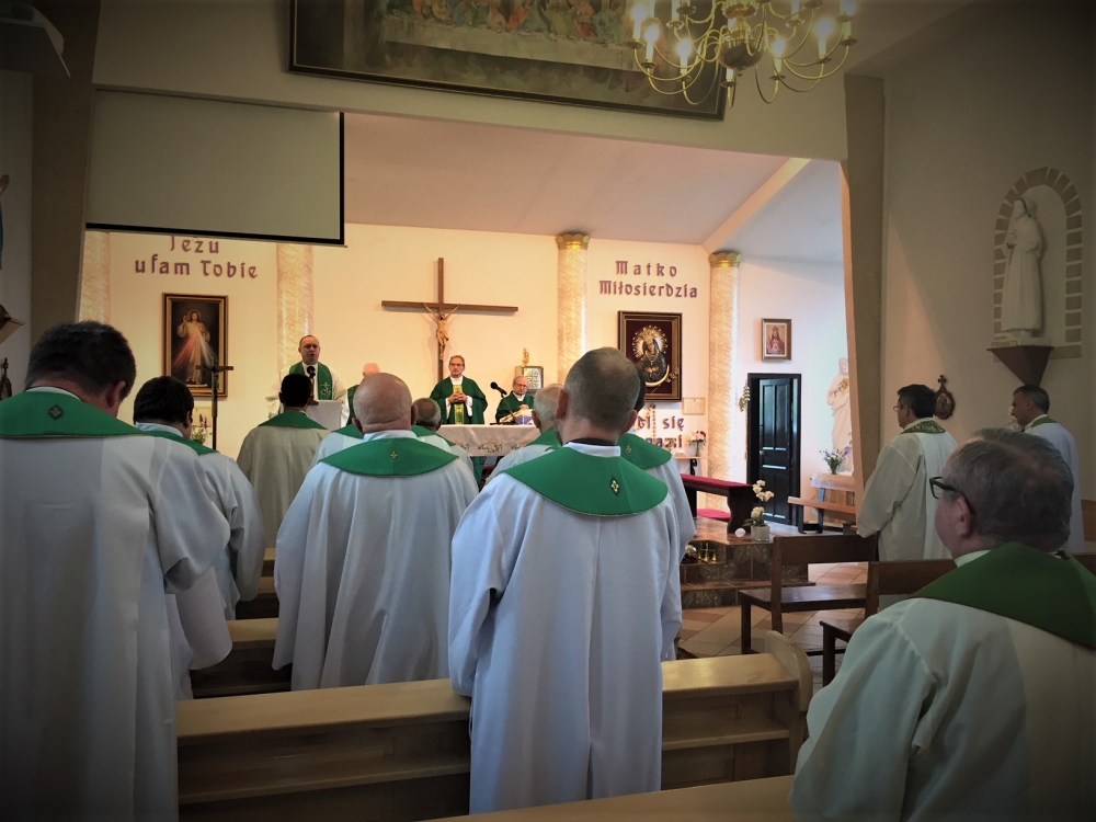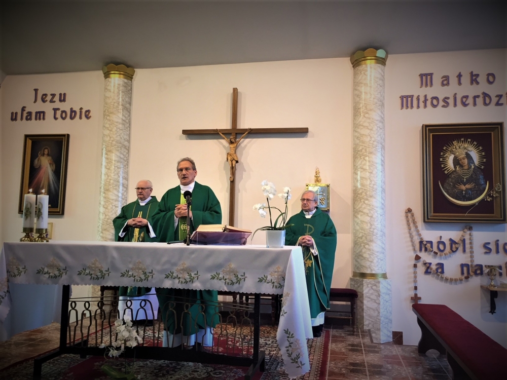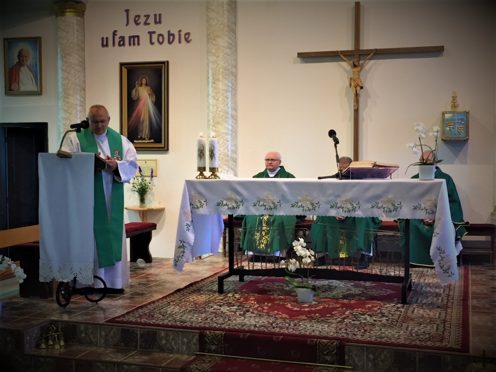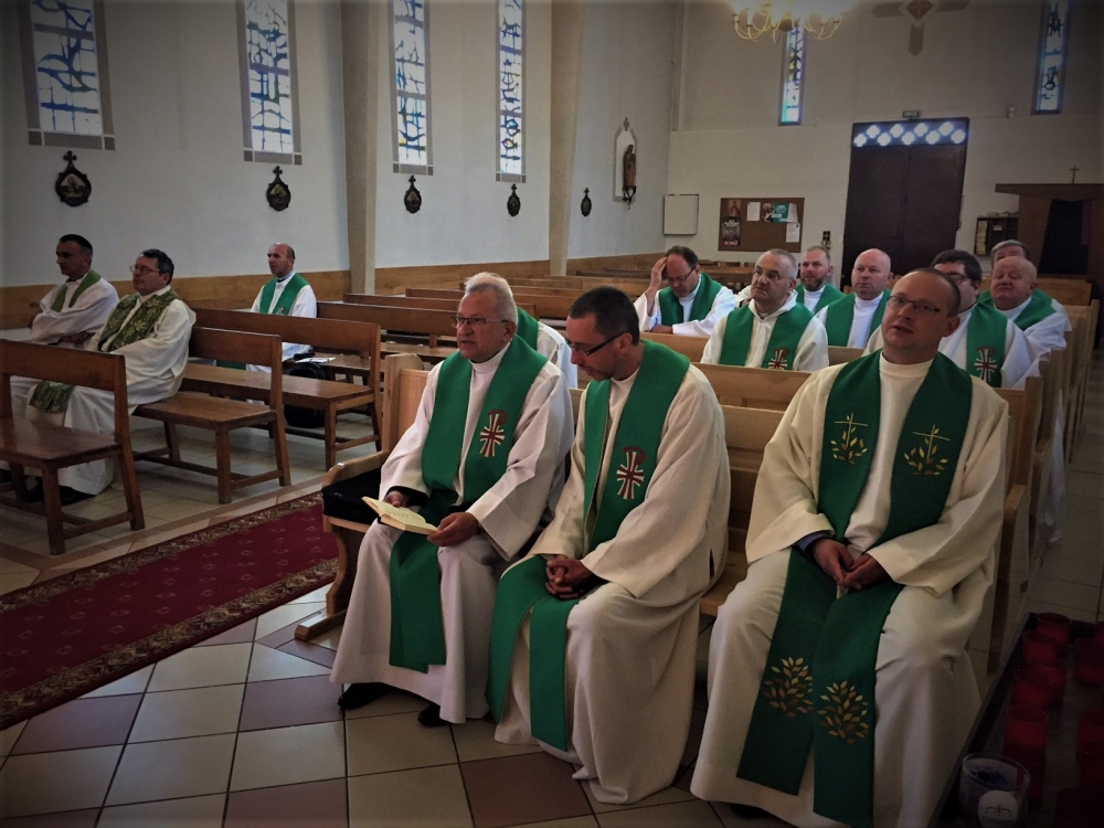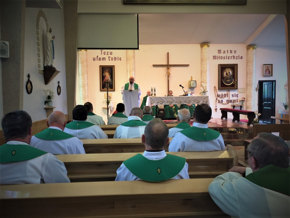 Następnie, w czasie wspólnej adoracji Najświętszego Sakramentu, była okazja do usłużenia sobie sakramentem pojednania i spowiedzi obecnych kapłanów. Po adoracji i spowiedzi, koncelebrowanej Mszy Świętej przewodniczył gospodarz a jednocześnie solenizant następnego dnia, ks. Antoni, przy ołtarzu towarzyszyli mu najstarsi czerwcowi solenizanci, ks. Jan Kałuża SChr i ks. Władysław Dobroć SChr, a wśród koncelebranców byli kolejni solenizanci, ks. prowincjał Jan Ciagło SChr i ks. Piotr Lizoń SChr. W homilii gość z Poznania nawiązał do Ewangelii dnia (Mt 5,13-16), przypominając Jezusowe „wy jesteście solą ziemi… wy jesteście światłem świata” tak bardzo pasujące, jak mówił, do posługi kapłanów zgromadzenia we Francji. Dalej mówił o roli soli i światła: sól pełniła kiedyś rolę oczyszczającą, chroni od zepsucia, dodaje smaku. Stanowi to wezwanie, by głosić Ewangelię jako naprawdę Dobrą Nowinę, radosną, dodającą ‘smaku’ do codziennego życia. Natomiast światłem jest przede wszystkim Jezus, wpatrujemy się w Niego, naśladujemy, patrzymy na światło, by widzieć, a On nam przewodzi, ukazuje cel drogi. Światło to także sygnał ostrzegawczy, potrzeba umiejętności upomnienia, ostrzeżenia… Na zakończenie rozważania, przywołując Chrystusowe: „Tak niech świeci wasze światło przed ludźmi, aby widzieli wasze dobre uczynki i chwali Ojca waszego, który jest w niebie” (Mt 5,16) wyjaśniał, że czynione dobro, greckie ‘agathos’, powinno być piękne i pociągające.