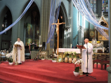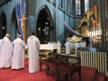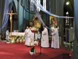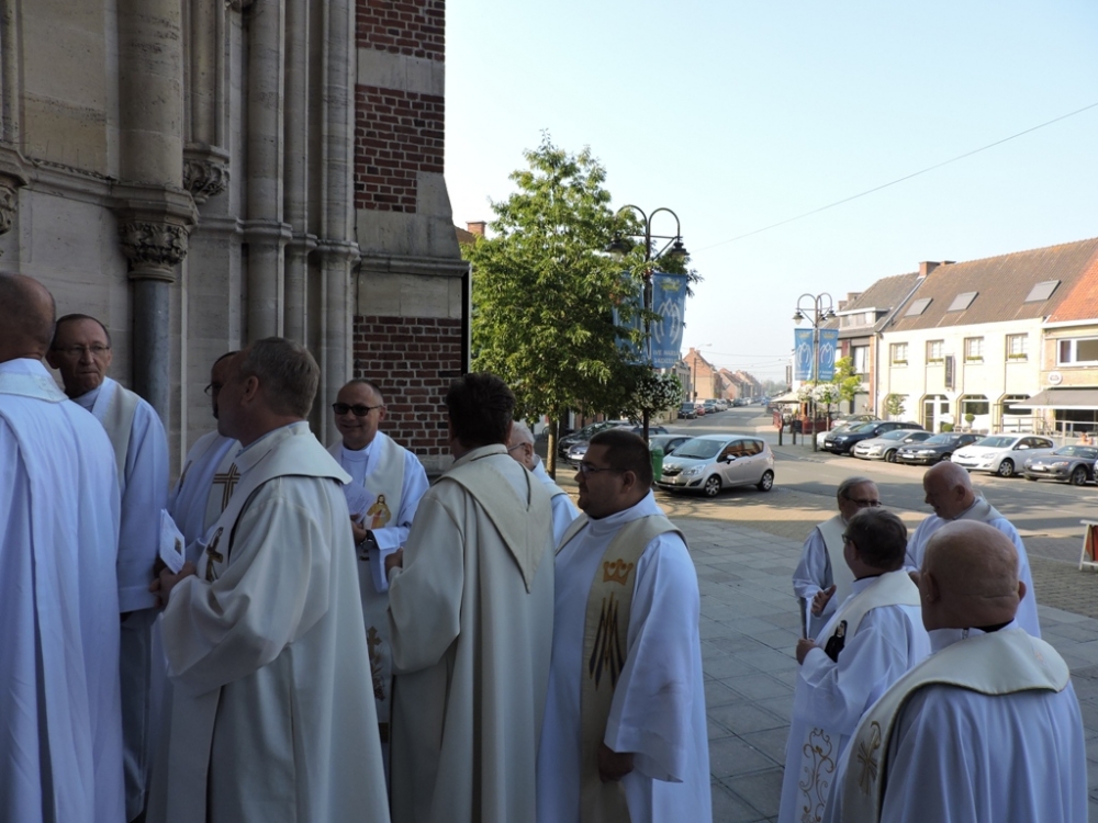 W przeżywanym Jubileuszowym Roku Miłosierdzia pielgrzymka przypadła w liturgiczne wspomnienie NMP Bolesnej, a bazylika w Dadizele to Kościół Jubileuszowy toteż Eucharystia rozpoczęła się od uroczystego przekroczenia Jubileuszowych Drzwi – przejścia przez Bramę Miłosierdzia a przewodzący wspólnej modlitwie ks. prałat dr Krystian Gawron, wicerektor PMK we Francji w wygłoszonym kazaniu zachęcał do ‘pocieszania’ Maryi przede wszystkim przez dobre, uczciwe, prawdziwie chrześcijańskie życie. W jubileuszowy rok wpleciona jest 1050. Rocznica Chrztu Polski, rocznice powstania bądź działalności zakonnych wspólnot, do których należą nasi duszpasterze, to wszystko jeszcze bardziej przynagla do stawania się rzeczywiście świadkiem Chrystusa. Ks. wicerektor zwrócił uwagę jeszcze na jedną jubileuszową rocznicę, mianowicie na jubileusz 300-lecia koronacji Ikony Jasnogórskiej; ikony, która towarzyszyła i towarzyszy polskiemu wychodźstwu na emigracyjnych szlakach (czego świadkiem mogą być kopie tego obrazu w wielu francuskich kościołach, gdzie sprawowana była bądź jest ‘polska’ Msza; niewielką kopię znajdujemy również w bazylice w Dadizele). I zachęcał, aby włączyć się w zaproponowaną przez Ojców Paulinów, kustoszów Jasnogórskiego Sanktuarium akcję Żywa Korona Maryi, bo „pragniemy – jak czytamy w internetowym serwisie akcji – ukoronować Maryję już nie złotymi koronami, ale naszym ewangelicznym życiem. Św. Ireneusz mówił: «Chwałą Boga [jest] żyjący człowiek». Aby tak się stało potrzeba nam nawrócenia. Chcemy też złożyć Maryi nasze duchowe dary – to one najbardziej ukazują, czy Maryja króluje w naszym życiu.” Jakże wiele bodźców, by coś z naszym życiem uczynić, by świadczyć o Bożej obecności i działaniu w tym świecie. Dlatego modlimy się za siebie wzajemnie, dlatego w sposób szczególny przyzywamy światła i darów Ducha Świętego dla katechetów, którzy będą przekazywać prawdy wiary kolejnym pokoleniom – pra- i praprawnukom tych, którzy przed niemalże 95-laty przyjeżdżali do kopalń w Nord i Pas-de-Calais.