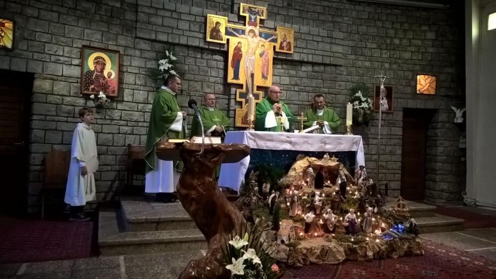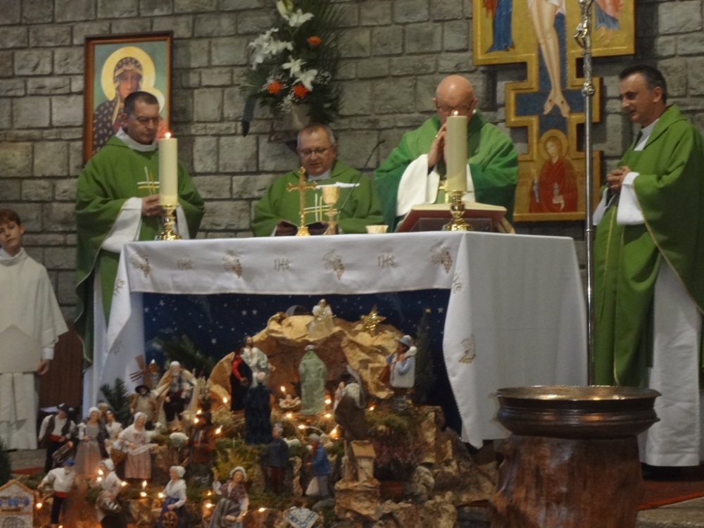 Spotkanie rozpoczęło się niemalże w samo południe Mszą Świętą w wypełnionym kościele św. Rocha we Fréjus pod przewodnictwem bpa Dominique Rey, ordynariusza diecezji Fréjus-Toulon (który chwilę wcześniej, po Eucharystii miejscowej wspólnoty francuskiej, pobłogosławił nową chrzcielnicę). Koncelebrowali: ks. Bogusław Brzyś Rektor Polskiej Misji Katolickiej we Francji, który wygłosił okolicznościowe kazanie, ks. Jan Ciągło SChr, przełożony francusko-hiszpańskiej prowincji chrystusowców i nasz duszpasterz, ks. Zbigniew Kret SChr.
