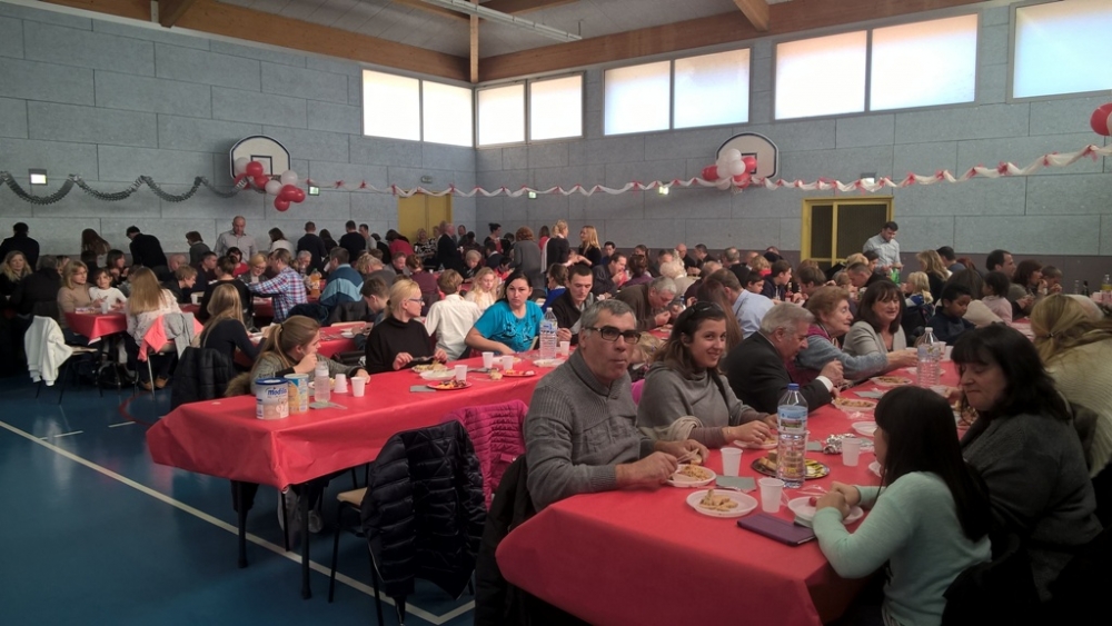 Po Mszy zgromadzeni goście udali się do sali Hippolyte Fabre, udostępnionej przez merostwo we Fréjus, aby podzielić się opłatkiem i spożyć wspólny obiad. Głównym punktem tej części spotkania czyli tzw. gwoździem programu były Jasełka przygotowane przez polskie dzieci i koncert polskich kolęd. Obecnych było ponad 160 osób, które przybyły z całego południa Francji: z Nicei i Marsylii, z Tulonu i Fréjus, z Grimaud i Agay, z Saint Maxime i Saint Tropez, etc. Nie bez kozery wspólnota polska uznawana jest w tym regionie Francji za jedną z najbardziej dynamicznie działających w Kościele grup emigracyjnych, grup etnicznych.