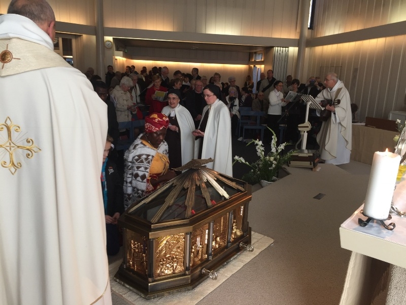 Po modlitwie po komunii Siostry Karmelitanki na ręce ksiedza proboszcza Fydy przekazały dar dla parafii w postaci relikwiarza I klasy z relikwią św. Elżbiety od Trójcy Świętej. Po zakończeniu Mszy obecni w kościele wierni oddali cześć relikwiom św. Elżbiety, w nowym ważącym 120 kg relikwiarzu przedstawiającym sceny z Jej życia. Tę cześć uroczystości poprowadził ks. Raoul Mutin, autor i wykonawca wielu pieśni i kompozycji liturgicznych, m.in. pieśni ku czci św. Elżbiety od Trojcy Świętej przygotowanych i wydanych na okazję jej kanonizacji na płycie CD. Oddający cześć relikwiom otrzymywali od Sióstr Karmelitanek pamiątkowe obrazki z modlitwą o wstawiennictwo Świętej. A potem uczestnicy uroczystości spotkali się w sali parafialnej na tradycyjnej lampce wina. Chętnym umożliwiono zakup bogato ilustrowanej książki karmelity Didier-Marie Golay pt. „Sainte Elisabeth de la Trinite – Rayonner Dieu” oraz płyty „Sainte Elisabeth de la Trinite” z pieśniami ku jej czci w wykonaniu ks. Raoula Mutin.