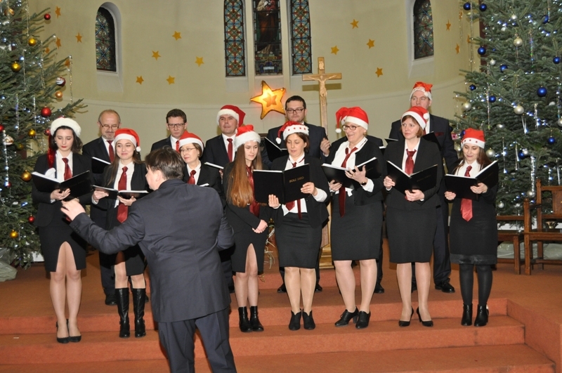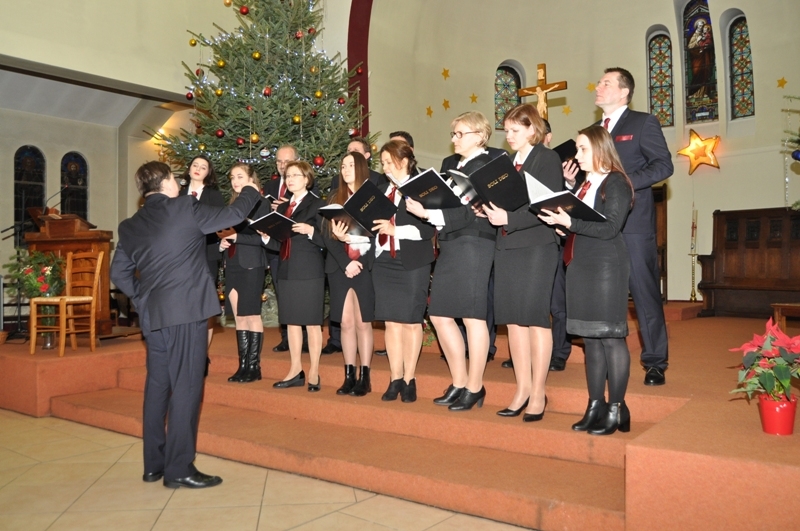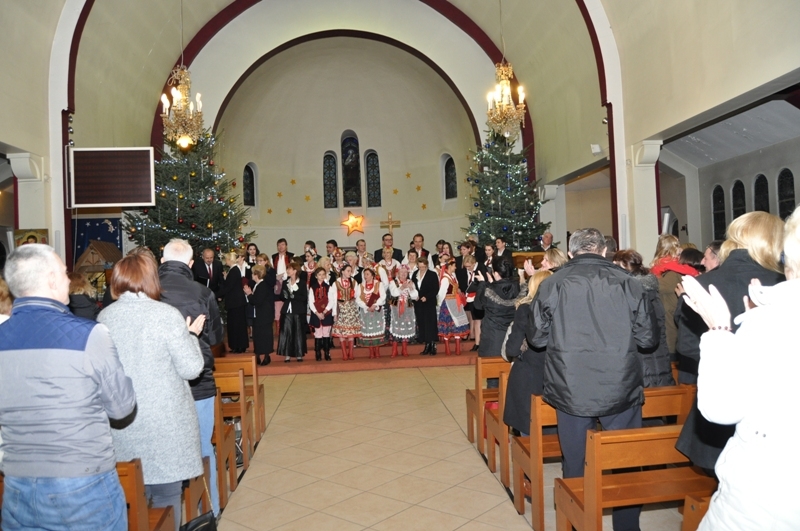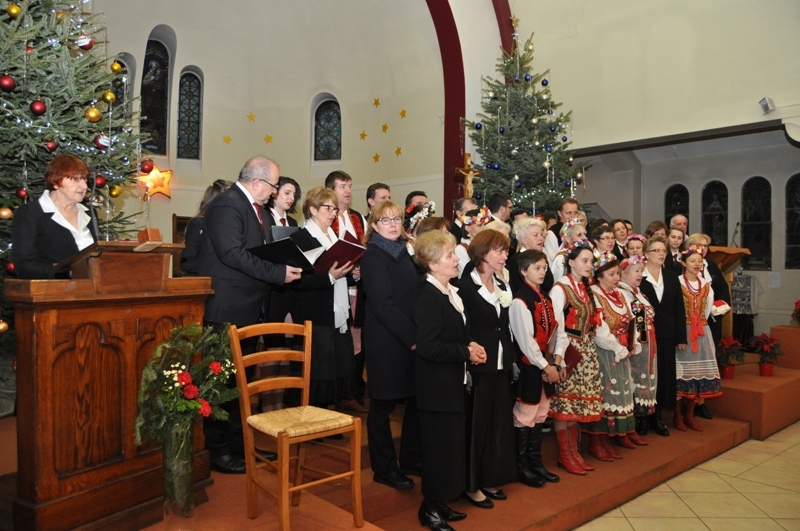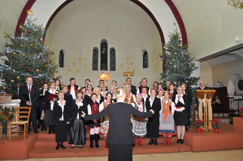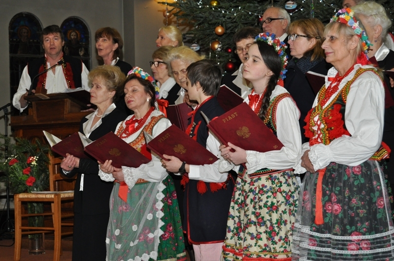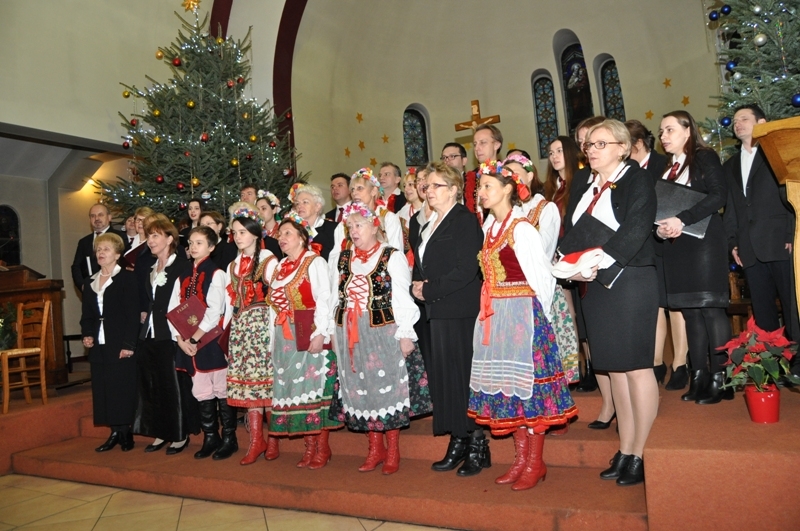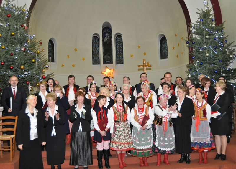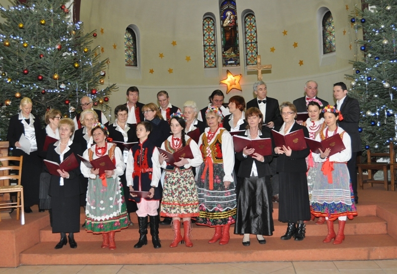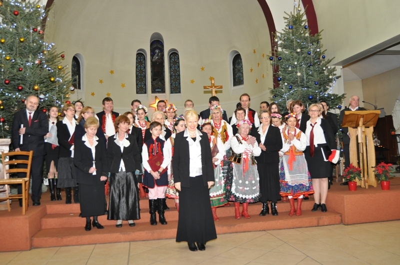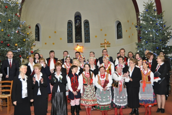Licznie zgromadzeni parafianie i zaproszeni goście wysłuchali ponad godzinnego koncertu kolęd w wykonaniu chórów: „Soli Deo”, „Piast” oraz zespołu „Polonez”. Wśród zaproszonych gości była pani Konsul Karolina Smaga z Paryża, i oczywiście nasi duszpasterze, proboszcz ks. Roman Wrocławski TChr i wikary ks. Ryszard Kaczor TChr. Na wstępie ks. Roman w kilku słowach powitał wszystkich przybyłych i zaprosił do wspólnego kolędowania. Lecz zanim ono nastąpiło, uczciliśmy minutą ciszy pamięć zmarłego przed kilkoma miesiącami śp. pana Mariana Blicharza, który był założycielem i dyrygentem chóru „Piast”. Każdy z chórów zaprezentował kolędy te znane i mniej znane, w pięknych aranżacjach, zaśpiewane na kilka głosów, a nawet w różnych językach – po łacinie, angielsku, czy francusku. Wśród nich zespół „Polonez”, który zaprezentował się w strojach ludowych, zaśpiewał piękną, lecz mało znaną „Kolędę dla nieobecnych”: Panie, daj nam wiarę, że to ma sens, że nie trzeba żałować przyjaciół. Że gdziekolwiek są, dobrze im jest, bo są z nami, choć w innej postaci. I przekonaj, że tak ma być, że po głosach tych wciąż drży powietrze. Że odeszli po to, by żyć, i tym razem będą żyć wiecznie. I jestem przekonana o tym, że w tym momencie, każdy z nas przybyłych na dzisiejszy wieczór, w sercu wspomniał o swoich bliskich, którzy już nie zasiądą z nami przy wigilijnym stole,  którzy przed laty, albo całkiem niedawno odeszli, lecz po to, aby żyć wiecznie…  Ten piękny, pełen świątecznej magii koncert, zakończyło wspólne odśpiewanie przez wszystkich chórzystów i publiczność kolędy „Bóg się rodzi”. Oczywiście każdy z chórów zebrał gromkie brawa od publiczności, co było dowodem na to, że bardzo się podobało. Po koncercie wszyscy zostali zaproszeni na lampkę ciepłego wina (grzańca) do parafialnej salki, gdzie mogliśmy kontynuować śpiew kolęd i innych piosenek. Był to bardzo miły i udany wieczór. Za rok musimy znowu spotkać się na wspólnym kolędowaniu, aby magia świąt przedłużała się, a miłość Chrystusa do człowieka czyniła cuda…