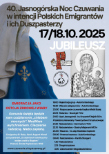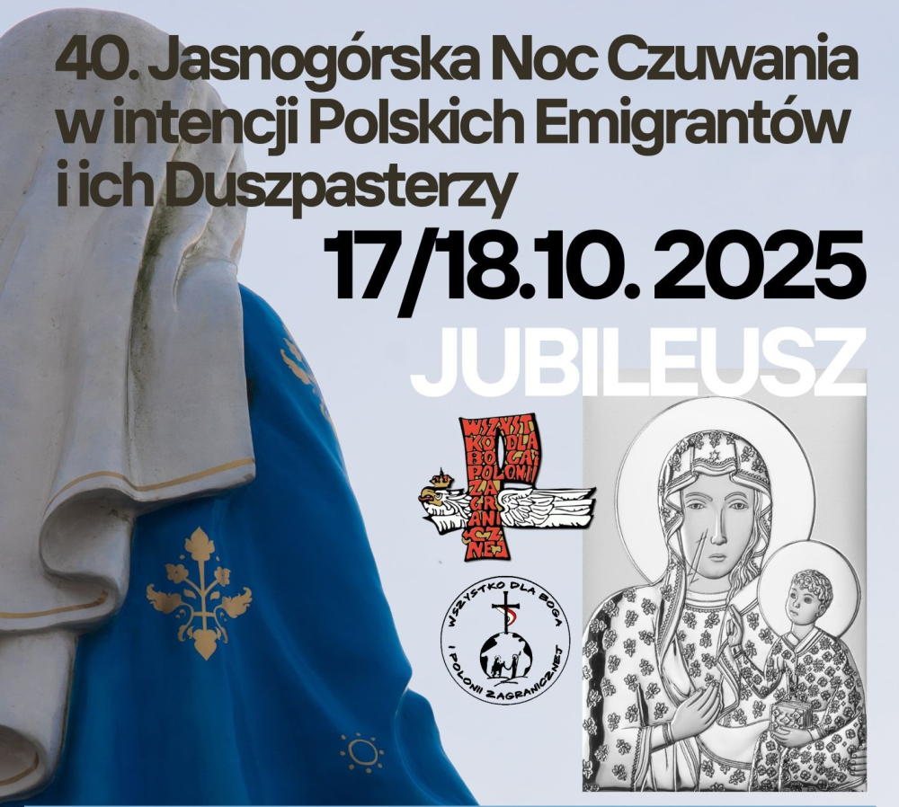 W nocy z 17/18 października 2025 r. (z piątku na sobotę) na Jasnej Górze odbędzie się jubileuszowa 40. Jasnogórska Noc Czuwania w intencji Polskich Emigrantów i ich Duszpasterzy, organizowana przez Towarzystwo Chrystusowe dla Polonii Zagranicznej wraz ze Zgromadzeniem Sióstr Misjonarek Chrystusa Króla.