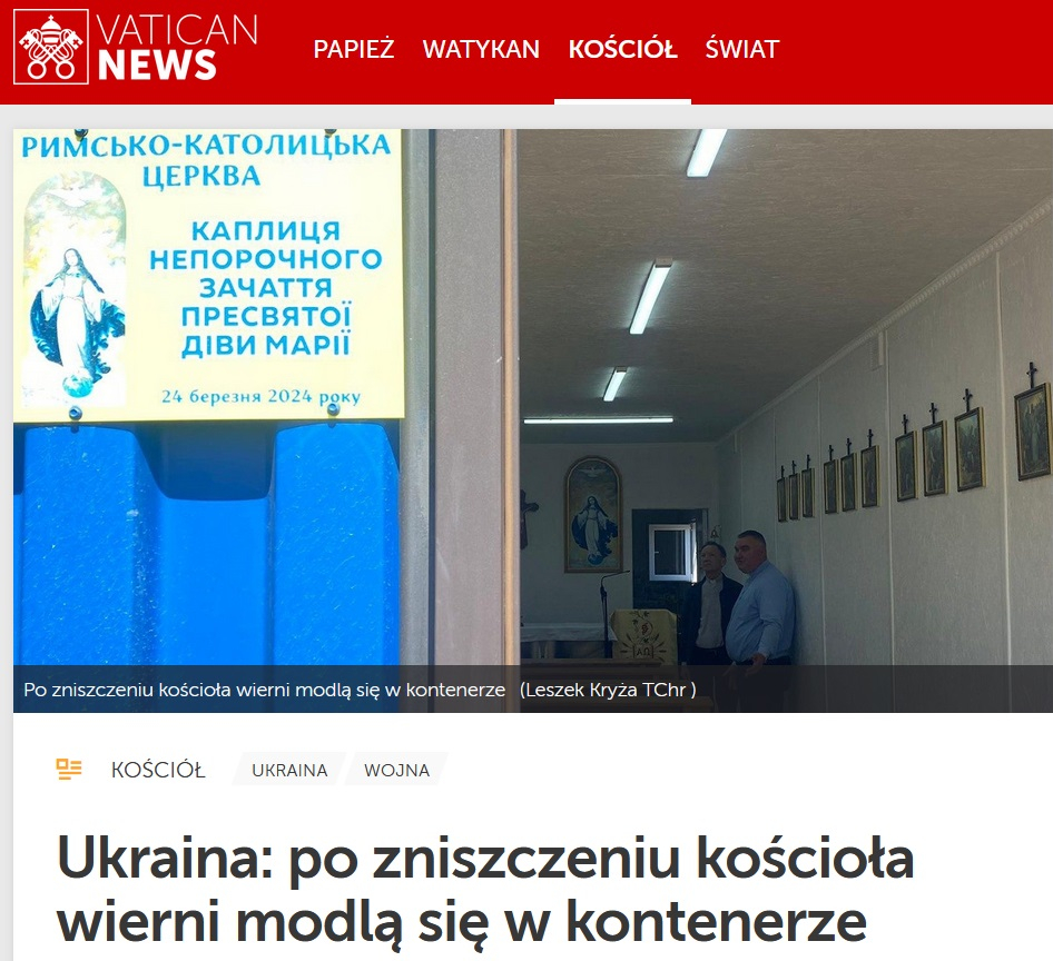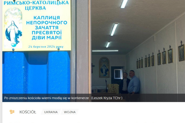 Tymczasem, jak informuje watykański serwis miedialny, mieszkańcy Ukrainy nie tracą ducha i mimo wojennych warunków troszczą się o swe życie wiary. Nie wszędzie jest to łatwe. We wsi Kisielówka rosyjski agresor zniszczył domy mieszkańców i miejscowy kościół. Gdy tylko ludzie mogli wrócić do siebie, poprosili o pomoc w zorganizowaniu miejsca modlitwy, gdzie mogliby się spotykać na Eucharystii. W tym celu zakupiono i dostosowano specjalny kontener, w czym pomógł Zespół Pomocy Kościołowi na Wschodzie przy Konferencji Episkopatu Polski. U progu Wielkiego Tygodnia AD 2024 inauguracji i poświęcenia dokonał ordynariusz diecezji odesko-symferopolskiej bp Stanisław Szyrokoradiuk OFM, a w uroczystości uczestniczył nasz przełożony generalny ks. Krzysztof Olejnik SChr (albowiem w Kisielówce posługują chrystusowcy, obecnie ks. Aleksandr Repin SChr). Nieco miesiąc później, na początku maja 2024 r. miejsce to odwiedził ks. Leszek Kryża SChr, dyrektor Biura Zespołu Pomocy Kościołowi na Wschodzie, który od początku wojny na Ukrainie już kilkakrotnie udawał się z pomocą humanitarną do tego kraju, tę pomoc nieustannie koordynuje i nią kieruje. W tych akcjach towarzyszy mu o. Luca Bovio IMC, Sekretarz Krajowy Papieskiej Unii Misyjnej. Zapraszamy zatem do lektury całego artykułu zamieszczonego na portalu VaticanNews.