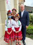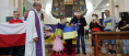 Po zakończonej manifestacji solidarności z Ukrainą i jej uchodźcami, szczególnie kobietami z małymi dziećmi i starcami (albowiem mężczyźni od 18 do 60 roku pozostali w kraju, aby walczyć o wolność swojego kraju z rosyjskim najeźdźcą), poszukającymi w ościennych krajach bezpieczeństwa rozpoczęliśmy uroczystą Mszę Świętą. Przewodniczył jej ks. Krzysztof Olejnik SChr, przełożony generalny Towarzystwa Chrystusowego, a koncelebrowali ks. prof. Mirosław Kalinowski, rektor KUL i ks. Zdzisław, miejscowy duszpasterz polonijny. Nasi przybyli z Polski Czcigodni i Dostojni Goście zostali powitani – zgodnie z polską tradycją – chlebem i solą przez Marię i Edwarda, dzieci małżonków lekarzy, którzy aktywnie uczestniczą w życiu naszej polskiej kapelanii. Z kolei Sergio Sechinski konsul honorowy RP i zarazem koordynator rady kapelanii polskiej skierował słowa powitania do ks. Generała
