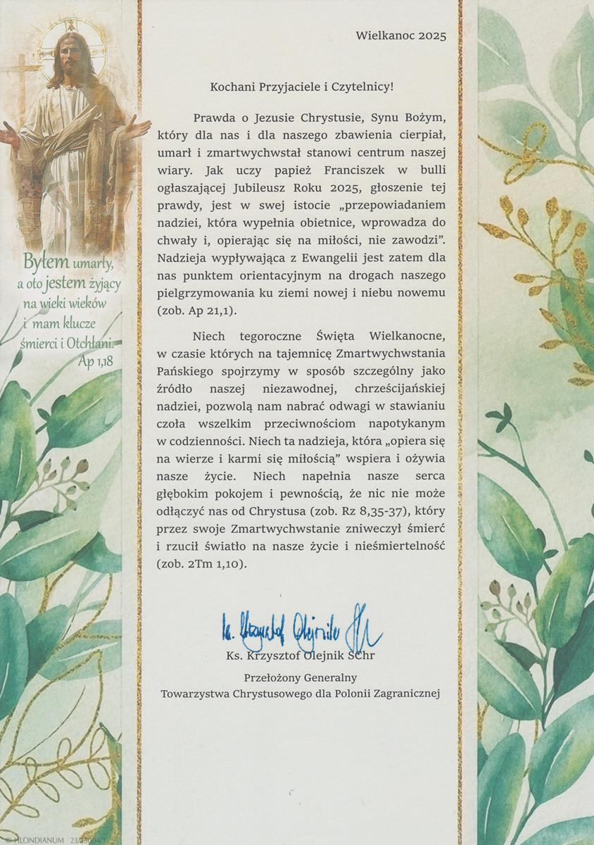 Niech tegoroczne Święta Wielkanocne, w czasie których na tajemnicę Zmartwychwstania Pańskiego spojrzymy w sposób szczególny jako źródło naszej niezawodnej, chrześcijańskiej nadziei, pozwolą nam nabrać odwagi w stawianiu czoła wszelkim przeciwnościom napotykanym w codzienności. Niech ta nadzieja, która „opiera się na wierze i karmi się miłością” wspiera i ożywia nasze życie. Niech napełnia nasze serca głębokim pokojem i pewnością, że nic nie może odłączyć nas od Chrystusa (zob. Rz 8,35-37), który przez swoje Zmartwychwstanie zniweczył śmierć i rzucił światło na nasze życie i nieśmiertelność (zob. 2 Tm 1,10).