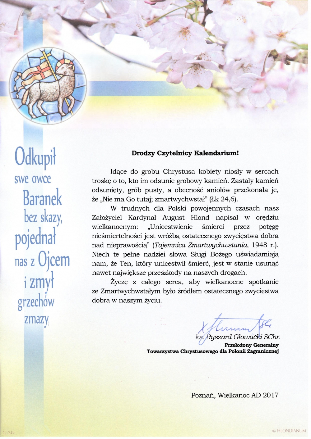 Przekazujemy wszystkim Czytelnikom Kalendarium życzenia wielkanocne Przełożonego Generalnego Towarzystwa Chrystusowego ks. Ryszarda Głowackiego SChr.