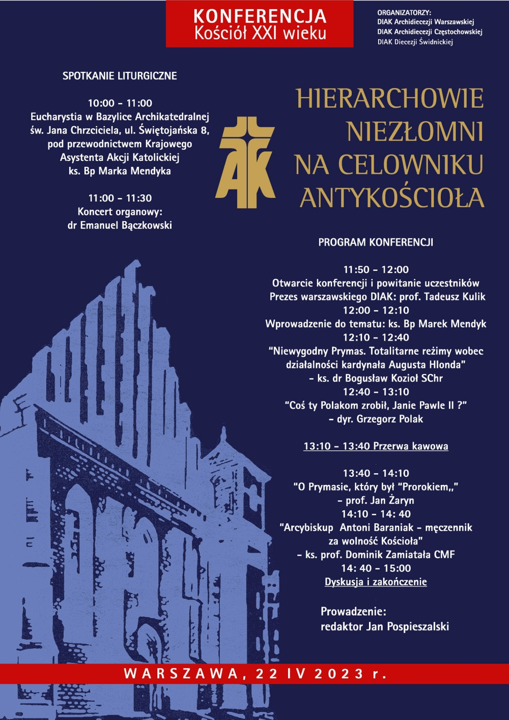 „Hierarchowie niezłomni na celowniku antykościoła” to temat konferencji, która odbyła się w sobotę 22 kwietnia 2023 r. w Sali im. Kard. Józefa Glempa Kurii Metropolitalnej Warszawskiej. Organizatorem był Diecezjalny Instytut Akcji Katolickiej Archidiecezji Warszawskiej (DIAK AW). Jedno z wystąpień dotyczyło Czcigodnego Sługi Bożego kard. Augusta Hlonda.