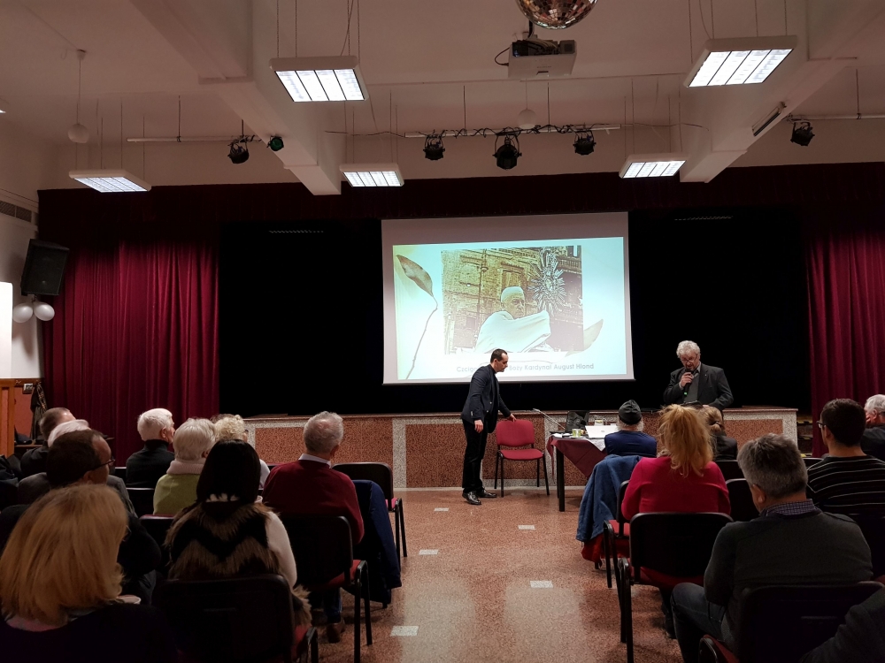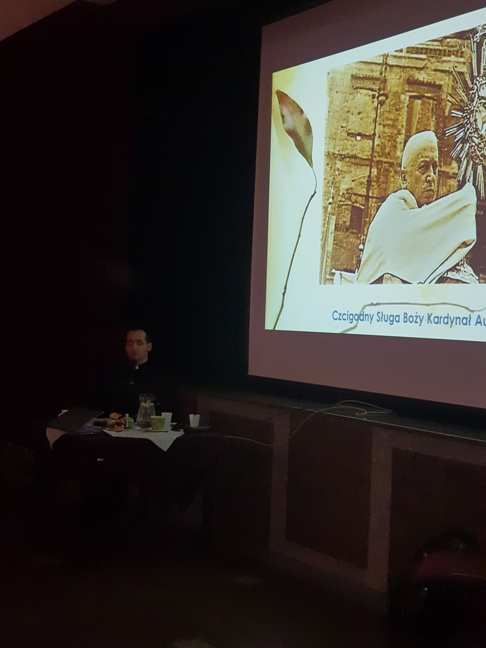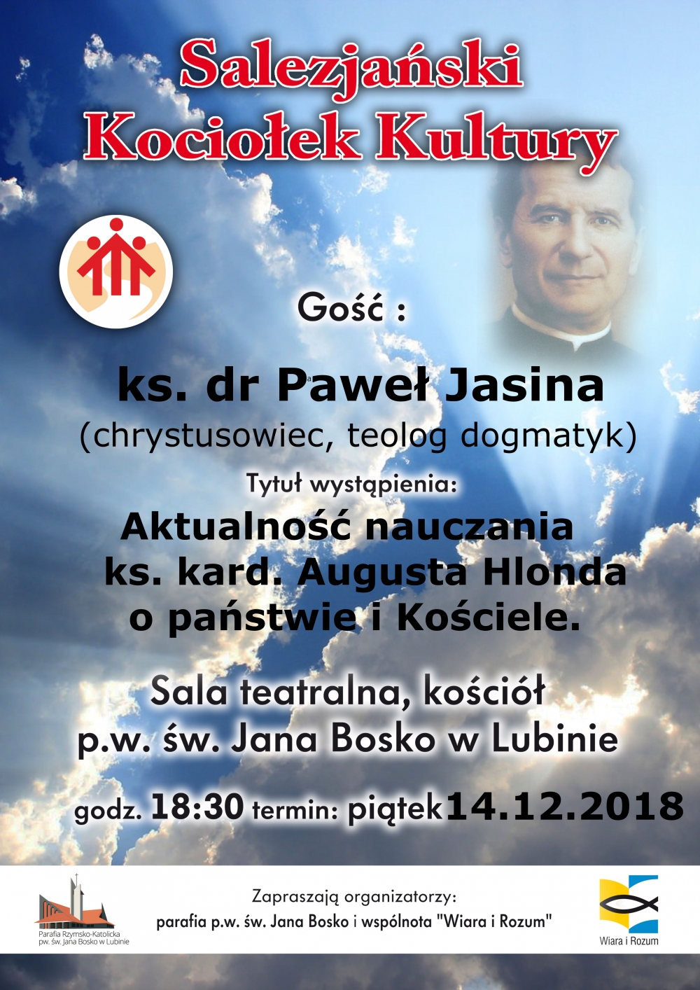 W piątek 14 grudnia 2018 roku w sali teatralnej przy parafii św. Jana Bosko w Lubinie odbyło się 65. spotkanie w ramach cyklu "Salezjański Kociołek Kultury". Zaproszony gość ks. dr Paweł Jasina SChr wygłosił dla licznie zgromadzonego audytorium wykład pt.: "Aktualność nauczania ks. kard. Augusta Hlonda o państwie i Kościele". Przed spotkaniem o godz. 18:00 celebrowana była Msza Święta. W intencji beatyfikacji ks. kard. Augusta Hlonda modlił się ss. Stanisław Gorczakowski SDB, proboszcz parafii oraz ks. Paweł, który przewodniczył liturgii i wygłosił homilię.