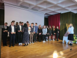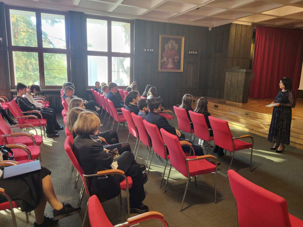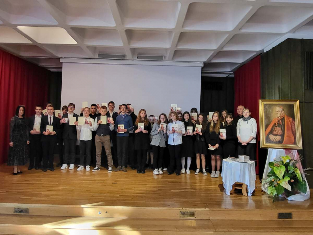 Po zakończeniu Eucharystii udaliśmy się do auli, gdzie mogliśmy w krótkim przedłożeniu usłyszeć kilka słów na temat osoby i nauczania kard. Augusta Hlonda. W dalszej części spotkania głos zabrała także Pani Dyrektor Barbara Ziółkowska, po którym nadszedł kulminacyjny moment, a więc nasze ślubowanie. Na pamiątkę tego wydarzenia wraz z naszą wychowawczynią otrzymaliśmy książkę z ważniejszymi myślami Czcigodnego Sługi Bożego kard. Augusta Hlonda. Po tej podniosłej chwili przyszedł czas na szczere i wzajemne podziękowania i życzenia pierwszaków oraz pani wychowawczyni.