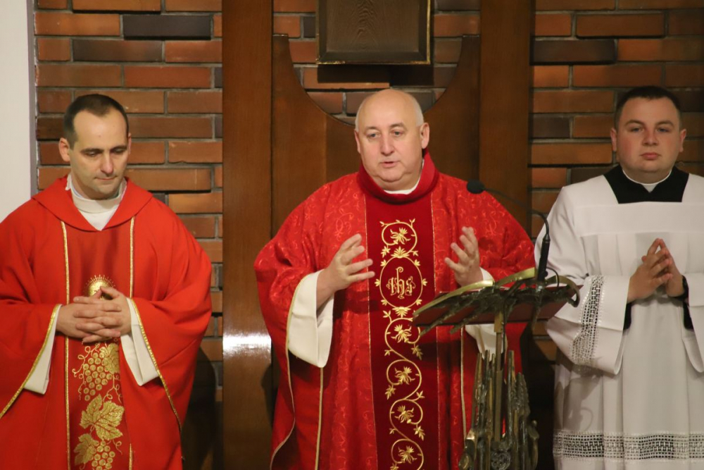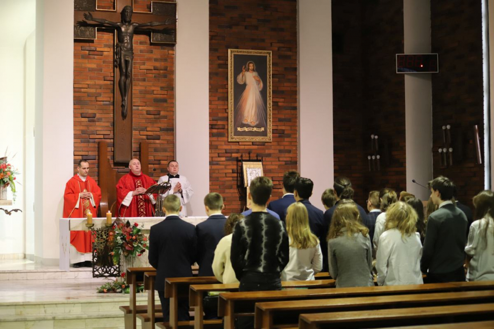 Ten podniosły dzień rozpoczęliśmy od uczestnictwa we Mszy Świętej, którą odprawił w intencji naszej szkolnej społeczności przełożony domu ks. Ryszard Szymanik SChr i koncelebrował ks. prefekt Paweł Jasina SChr, który podczas każdych odwiedzin naszej szkoły przybliża nam postać jej Patrona i Założyciela jego zakonnej wspólnoty.