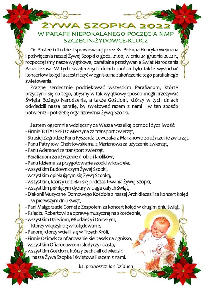 Jeszcze większe zainteresowanie mediów (ale nie tylko) zanotowała Żywa Szopka organizowana już po raz dziesiąty w parafii pw. Niepokalanego Poczęcia NMP w Szczecinie Żydowcach, która też była jedyną w całym mieście. Przez cały świąteczny czas przychodzili ludzie, najczęściej rodziny z dziećmi, by chociaż przez chwilę doświadczyć atmosfery tej szczególnej betlejemskiej nocy. W świąteczne dni odbywały się koncerty kolędowe, a całość zwieńczyło wspólne, można powiedzieć rodzinne, ognisko ze śpiewem kolęd i pastorałek przy akordeonowym akompaniamencie ks. Roberta Nalepki SChr, który przybył do Szczecina Żydowiec z duszpasterską, świąteczną pomocą. Przed świętami w szczecińskim oddziale TVP wyemitowano reportaż o przygotowaniach do Żywej Szopki wraz z wypowiedzią proboszcza parafii ks. Jana Dziducha SChr zapraszającego do przyjazdu i przedstawiającego ramowy program. Fotogalerie prezentują, poza stroną parafii, internetowe serwisy szczecińskich dzienników. Oczywiście informację o Żywej Szopce znajdziemy w świątecznej „Kronice” – serwisie informacyjnym TVP3 Szczecin (materiał o Żywej Szopce między 8:30 a 11 minutą programu).
