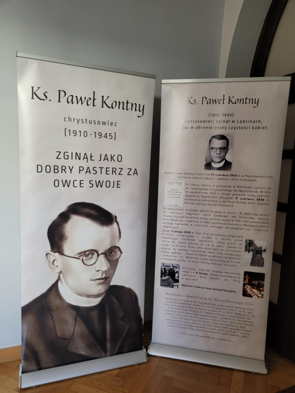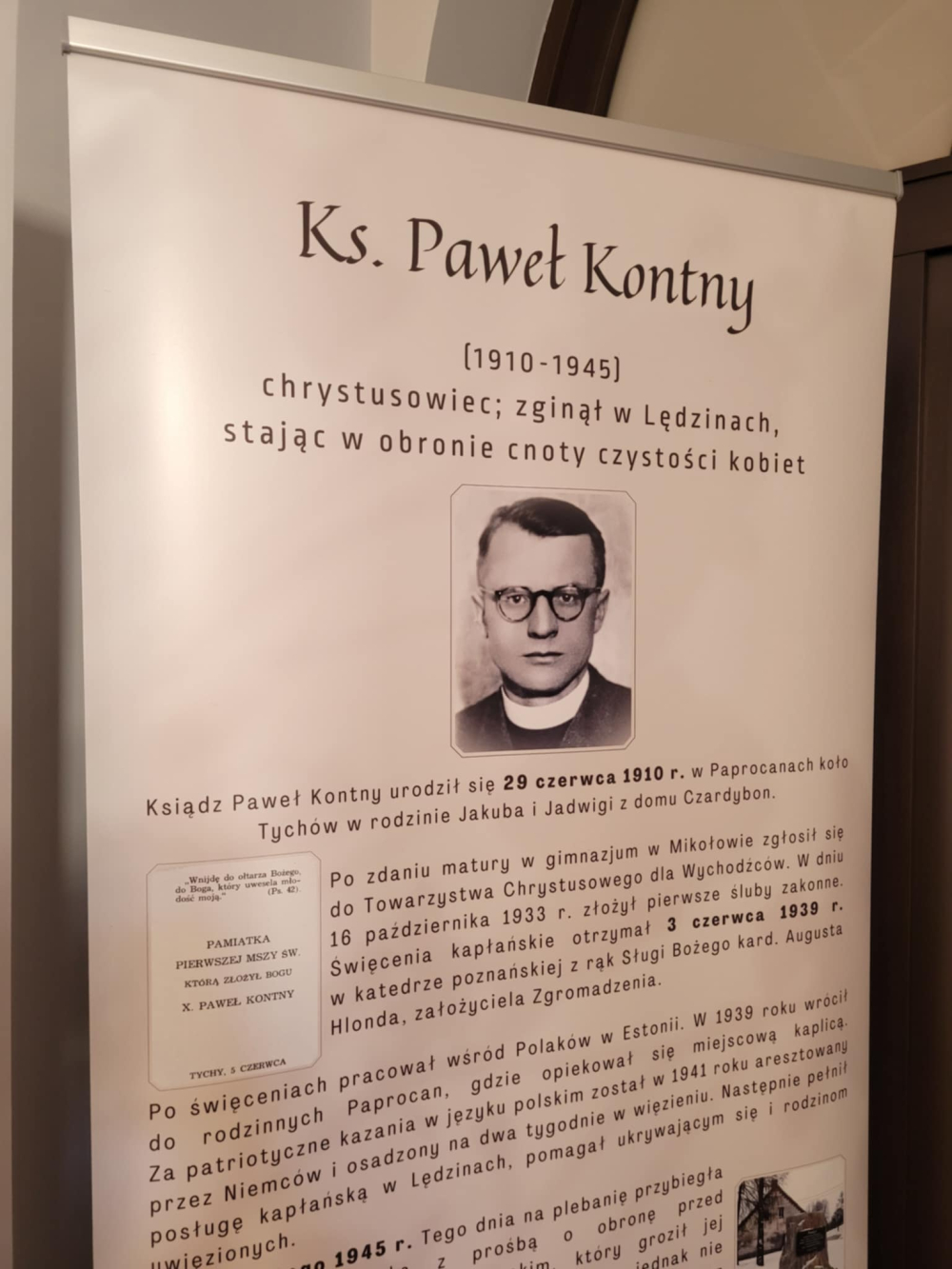 - wykonanie plansz (rollup-ów) o ks. Pawle - jeden egzemplarz znajduje się w kościele w Lędzinach, a jeden będzie można wystawiać w różnych kościołach w diecezji (obecnie znajduje się przy wejściu do Kurii w Katowicach);