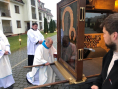 Powitanie Obrazu nastąpiło ok. godz. 7:30 na klasztornym dziedzińcu, następnie Obraz uroczyście został wniesiony do kaplicy pw. Chrystusa Uchodźcy, gdzie rozpoczęła się koncelebrowana Eucharystia pod przewodnictwem przełożonego generalnego ks. Krzysztofa Olejnika SChr. Okolicznościowe kazanie z wieloma osobistymi wtrąceniami wygłosił ks. Ryszard Głowacki SChr, były przełożony generalny, przypominając w nim nasze duchowe dziedzictwo zawarte w pismach ojców naszej zakonnej wspólnoty. Przedstawiając je, skupił się przede wszystkim na maryjnym rysie w życiu i nauczaniu kard. Augusta Hlonda i o. Ignacego Posadzego, z licznymi odniesieniami do tego, co oni powiedzieli bądź napisali czy o nich powiedziano bądź napisano.