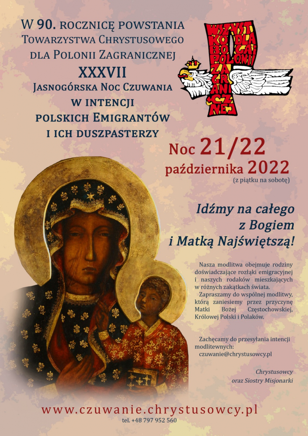 Z naszymi Parafianami i Siostrami Misjonarkami, z naszymi Rodzinami, Przyjaciółmi i Dobrodziejami, z Ruchem Apostolatu Emigracyjnego wyruszamy z pielgrzymką w noc 21/22 października 2022 r., aby zrealizować te dobre zamiary i pragnienia, a także po to, by jeszcze raz całą Polonię i ich duszpasterzy oddać pod płaszcz macierzyńskiej opieki Maryi…