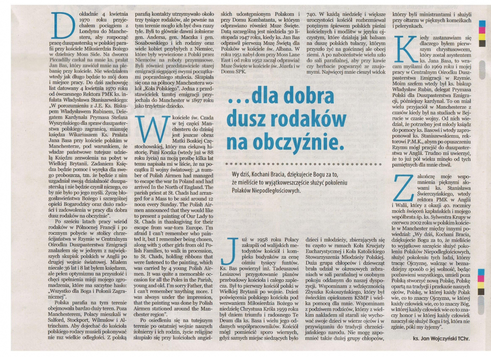 Moje wspomnienia zakończę pięknymi słowami ks. Stanisława Świerczyńskiego, wtedy rektora PMK w Anglii i Walii, który z okazji 40. rocznicy moich święceń kapłańskich i mojego współbrata śp. ks. Sylwestra Krupy, w czerwcu 2002 r., w polskim kościele w Manchester między innymi powiedział: „Wy dziś, Kochani Bracia, dziękujecie Bogu za to, że mieliście to wyjątkowe szczęście służyć pokoleniu Polaków Niepodległościowych, służyć pokoleniu tych ludzi, którzy tracąc Ojczyznę, walcząc w beznadziejny sposób o jej wolność, będąc pozbawieni wszystkiego, umieli poza Polską stworzyć nową Polskę, Polskę opartą na tradycji i przekazie naszych ojców, Polskę, w której każdy Polak wie, co to znaczy Ojczyzna, w której każdy człowiek wie, co to znaczy Bóg, w której każdy człowiek wie co to znaczy honor i w której każdy człowiek nauczył się służyć Bogu i tej, która nie zginie, póki my żyjemy”.