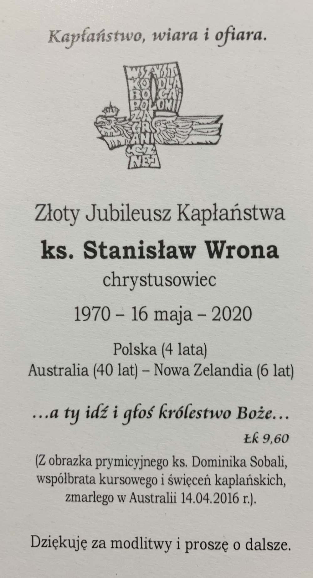 16 maja 2020 r. Złoty Jubileusz Kapłaństwa obchodził ks. Stanisław Wrona SChr. Obecnie posługuje Polonii australijskiej w Melbourne (Sanktuarium Bożego Miłosierdzia - KEYSBOROUGH). Do wspólnego dzielenia radości z jubilatem i wyśpiewania TE DEUM obok posługujących w Melbourne Keysborough Rektora Sanktuarium ks. Kamila Żyłczyńskiego SChr i ks. Mariusza Sokołowskiego SChr, włączyli się kapłani, którzy przybyli gościnnie: ks. Tadeusz Ziółkowski SChr, ks. Andrzej Mądry CR a także Siostry Misjonarki Chrystusa Króla dla Polonii: s. Marietta i s. Elżbieta. Z racji na obowiązujące restrykcje związane z koronawirusem, w mszy jubileuszowej mogło uczestniczyć tylko dziesięciu wiernych. Uroczyste świętowanie zaplanowane jest na czas po kwarantannie.
