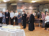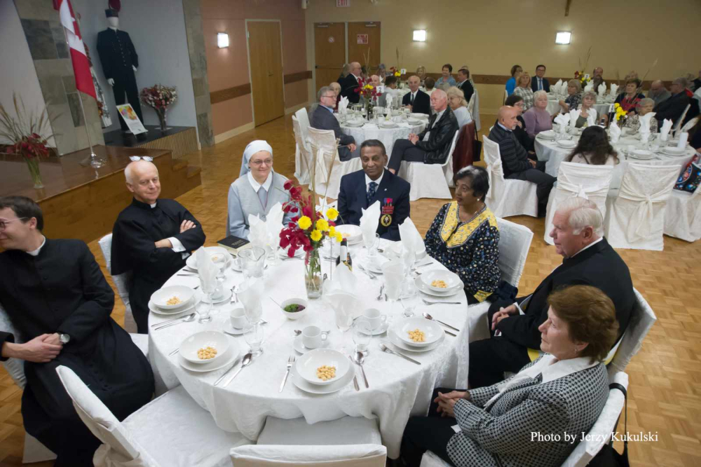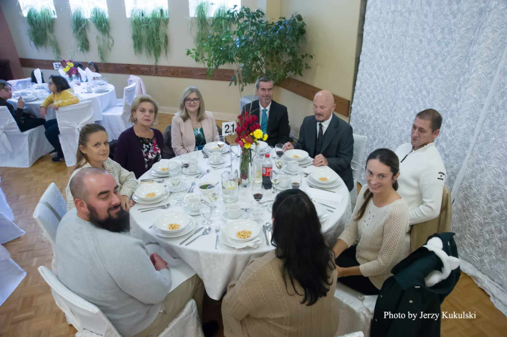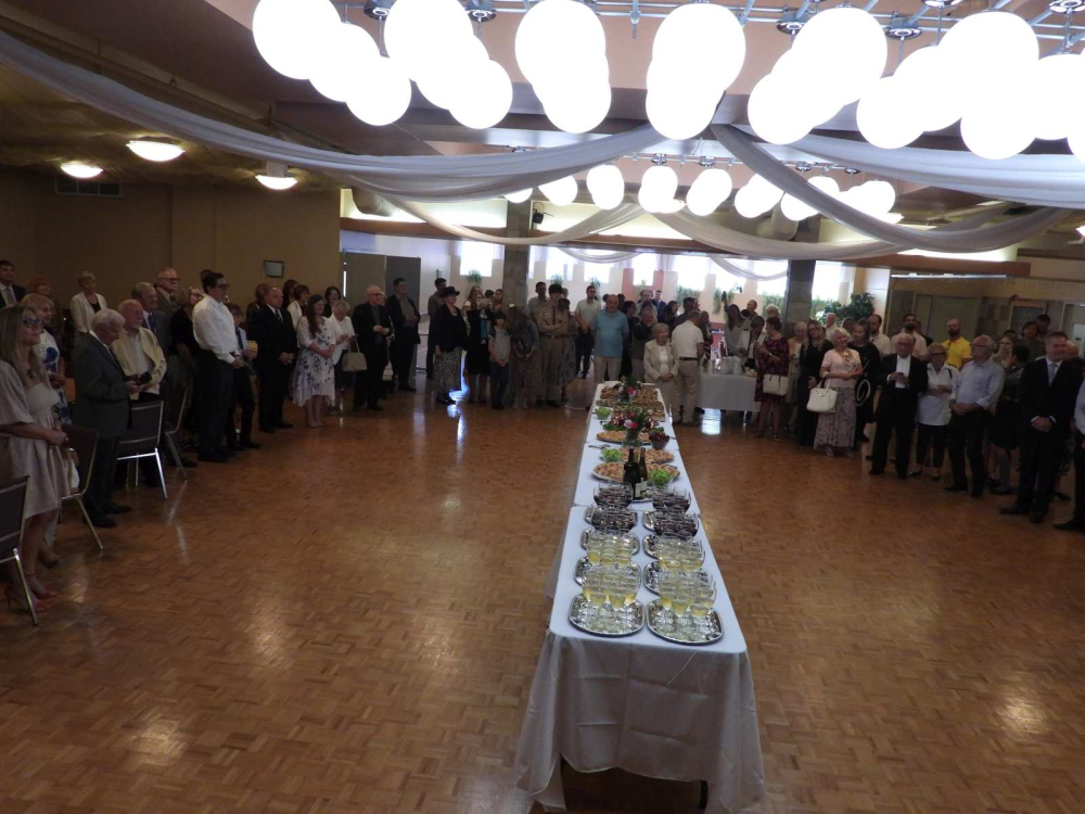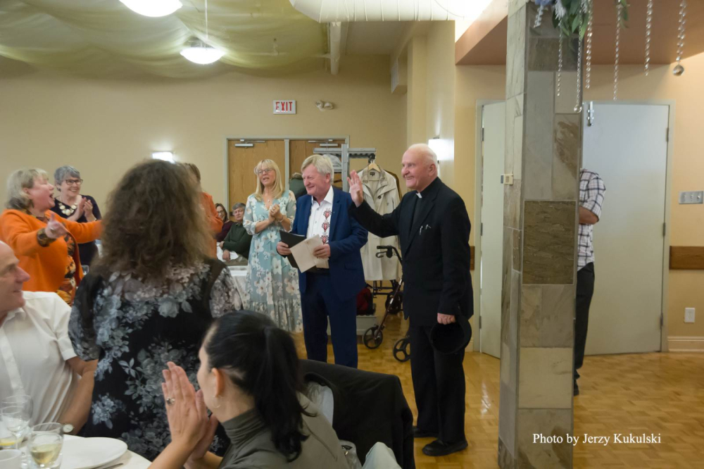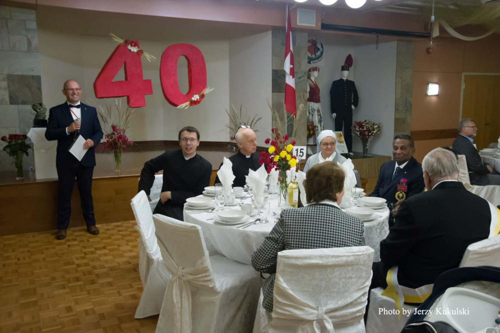 Natomiast w niedzielę 15 października 2023 r. kontynuowaliśmy świętowanie 40. rocznicy powstania naszej polonijnej parafii. Gościliśmy w tym dniu Dostojnego Jubilata – celebrującego 90. urodziny ks. Stanisława Kuczaika SChr, który był drugim proboszczem parafii i który podjął rozpoczęte przez ks. Olbrysia dzieło budowania wspólnoty. Ewangelia tej niedzieli mówiła o uczcie weselnej, która zapowiadała Najświętszą Ofiarę – Mszę Świętą (por. Mt 22,1-14). Po tej niedzielnej Mszy zeszliśmy do sali parafialnej na uroczysty obiad przygotowany przez Rycerzy Kolumba. Serdeczne dziękujemy wszystkim zaangażowanym w organizację tego pięknego wydarzenia. Panu Krzysztofowi Frodymie dziękujemy za pyszny obiad! Cieszymy się, że mogliśmy liczyć na młodzież, która piękne obsługiwała stoły.