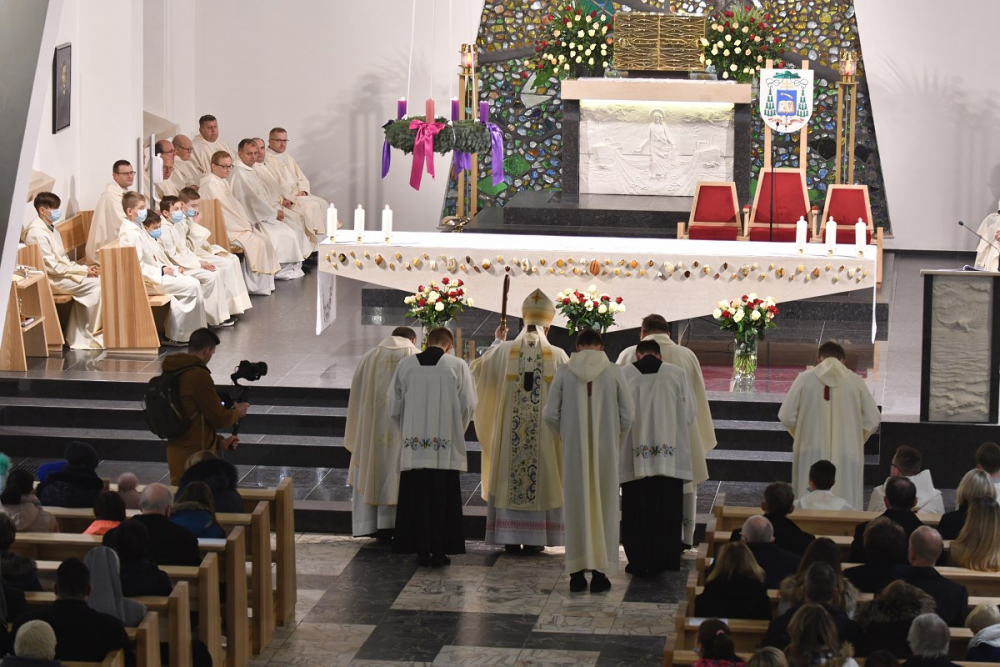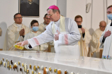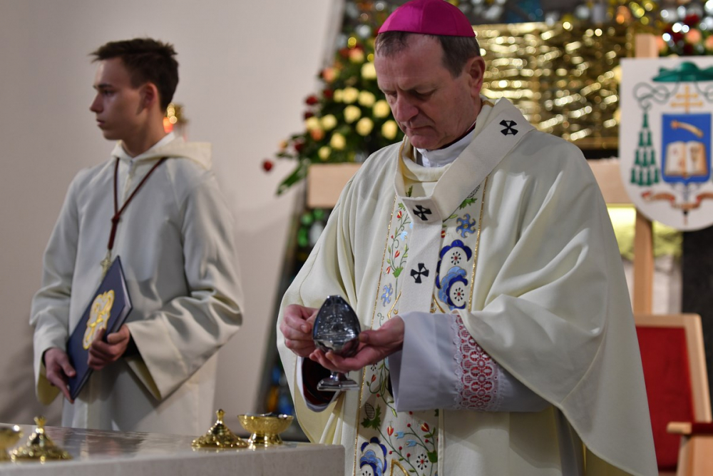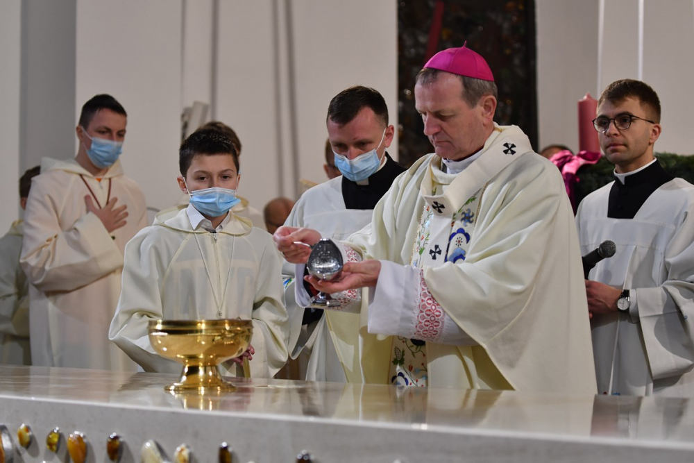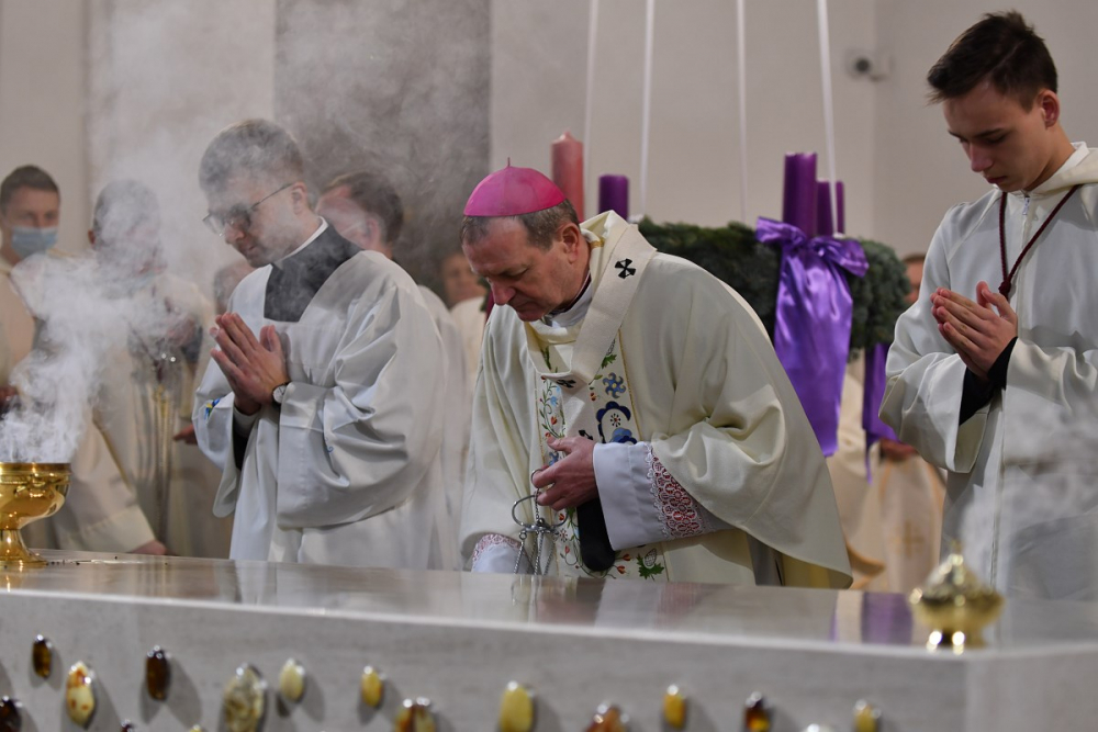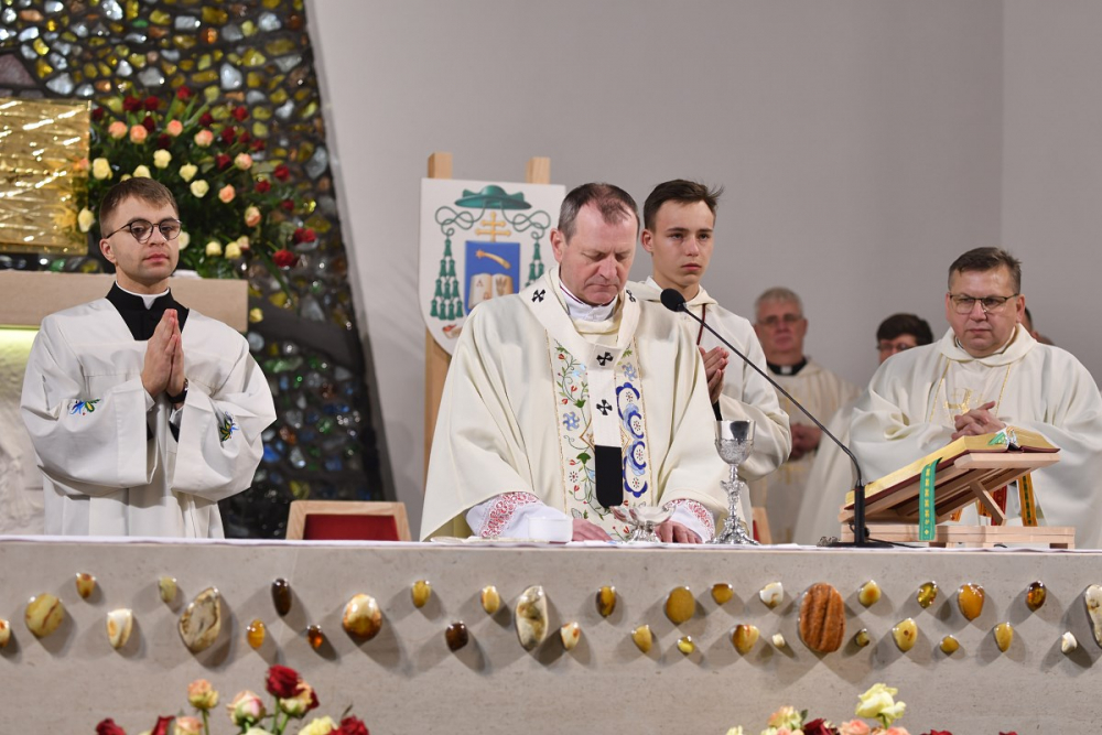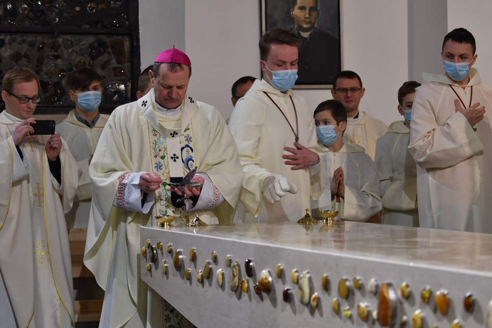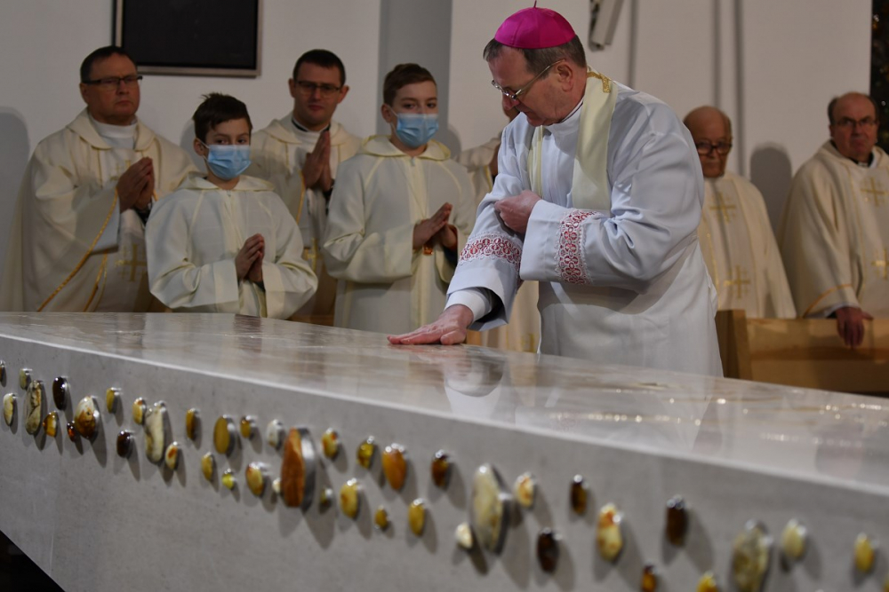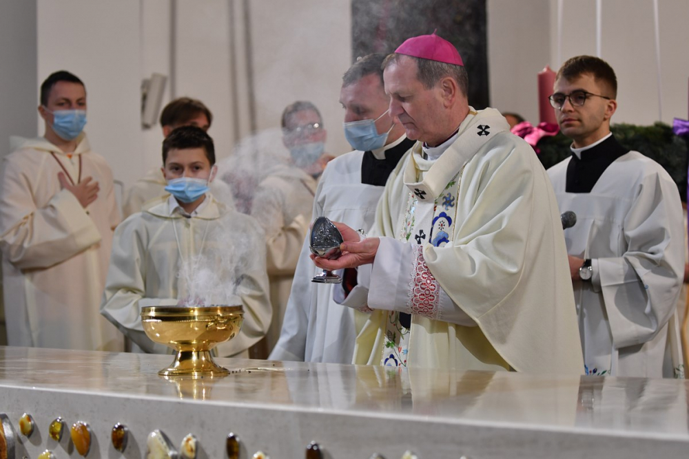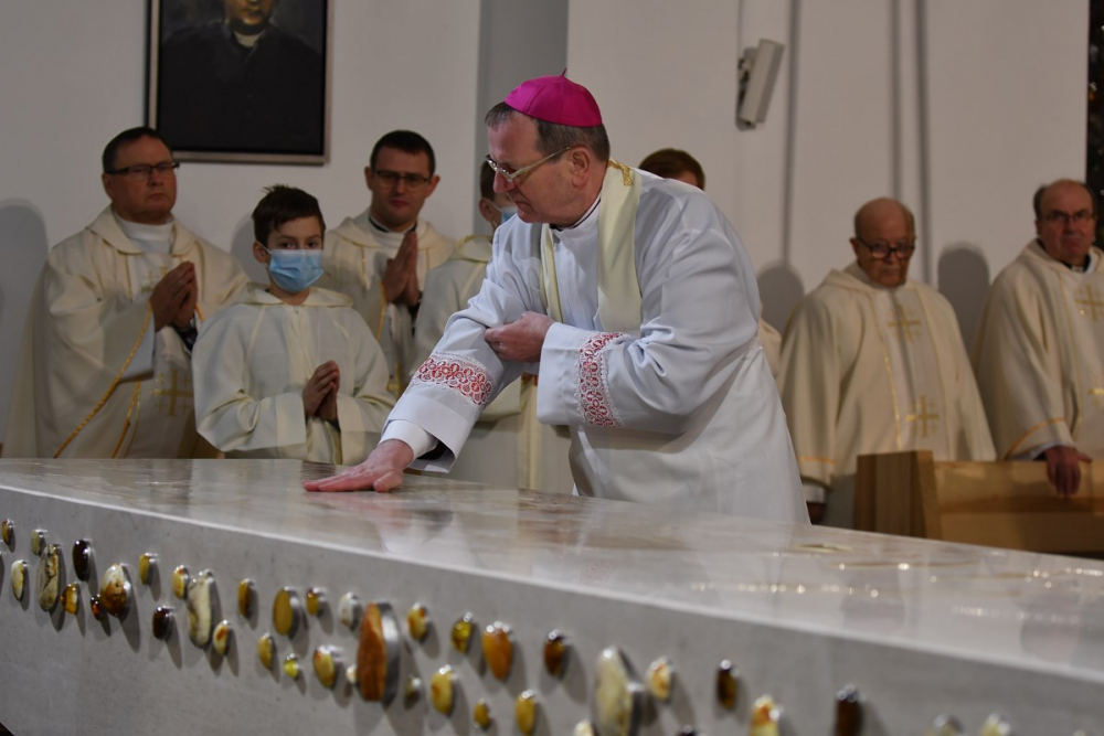 W wygłoszonym słowie przypomniał rolę Maryi w historii zbawienia oraz o naszym powołaniu do świętości, które wybrzmiewa w odczytywanym tego dnia drugim czytaniu (zob. Ef 1,3-6.11-12). Pawłowe słowa o naszym wybraniu w Jezusie Chrystusie, byśmy byli święci i nieskalani (por. Ef 1,4) wraz z maryjnymi przywilejami Jej niepokalanego poczęcia i wniebowzięcia stanowią wezwanie, by to powołanie nieustannie podejmować, biorąc za ideał, wzór oraz wspomożycielkę i opiekunkę Maryję. Może wydawać się to trudne, może niezrozumiałe, ale gdy powierzymy się Panu Bogu: On na pewno dopomoże i udzieli swojej łaski, tak, jak obdarowana, przepełnioną nią została Maryja (por. Łk 1,28). Wielką pomocą w dokonywaniu właściwych wyborów na drogach życia jest nasze uczestnictwo w Eucharystii, albowiem przyjmujemy z ołtarza samego Boga, który pragnie nas przepełniać swoją obecnością i miłością. I dlatego poświęcamy ołtarz, by był miejscem składania i naszego jednoczenia się z Przenajświętszą Ofiarą Jezusa Chrystusa.