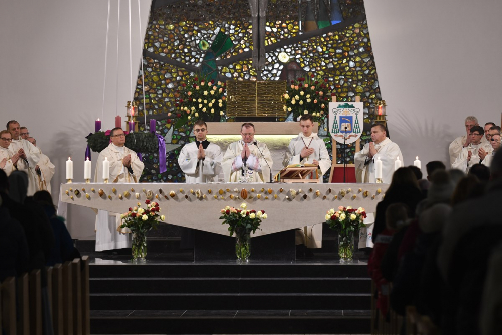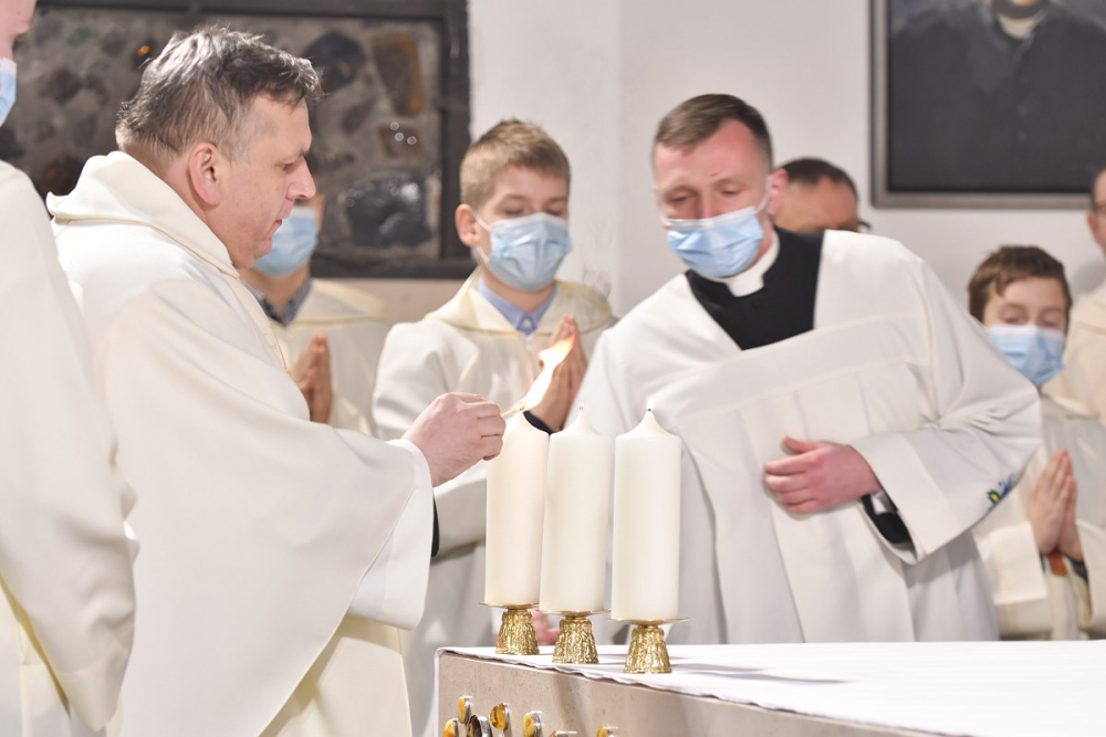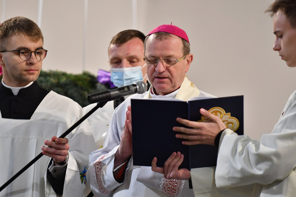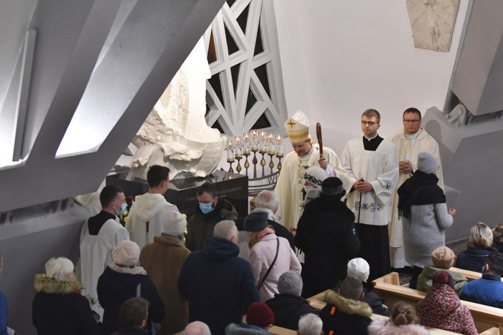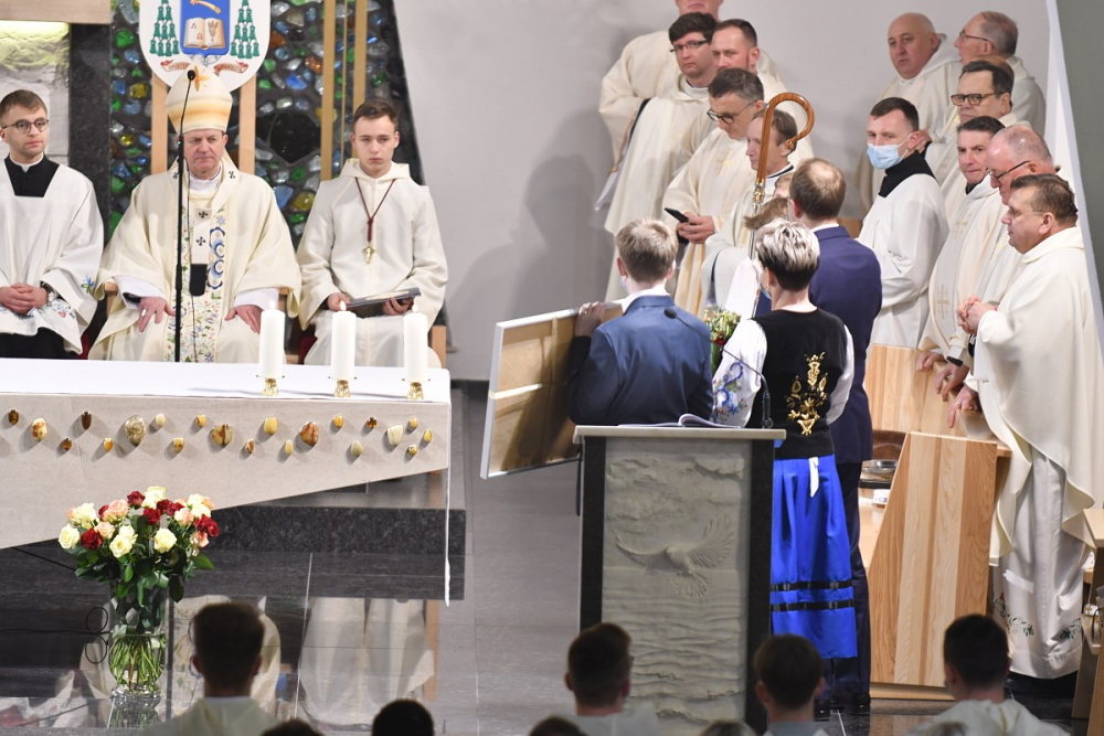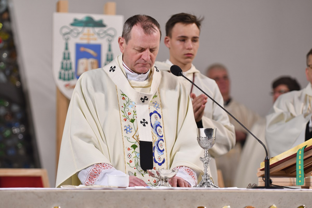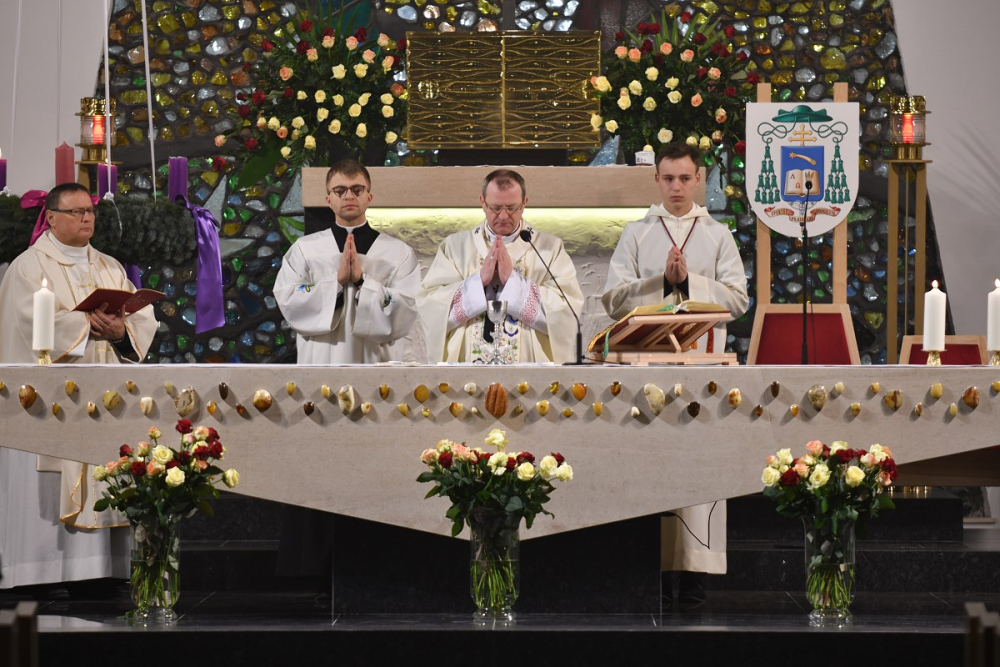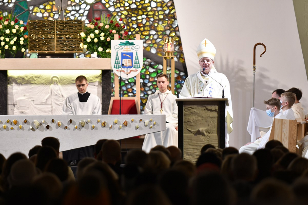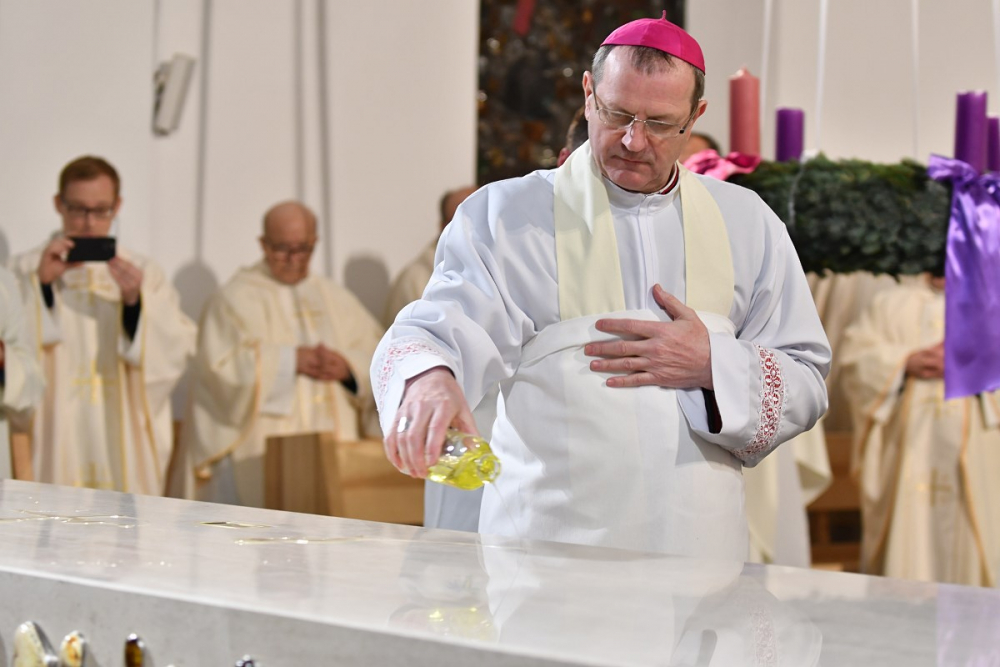 W wygłoszonym słowie przypomniał rolę Maryi w historii zbawienia oraz o naszym powołaniu do świętości, które wybrzmiewa w odczytywanym tego dnia drugim czytaniu (zob. Ef 1,3-6.11-12). Pawłowe słowa o naszym wybraniu w Jezusie Chrystusie, byśmy byli święci i nieskalani (por. Ef 1,4) wraz z maryjnymi przywilejami Jej niepokalanego poczęcia i wniebowzięcia stanowią wezwanie, by to powołanie nieustannie podejmować, biorąc za ideał, wzór oraz wspomożycielkę i opiekunkę Maryję. Może wydawać się to trudne, może niezrozumiałe, ale gdy powierzymy się Panu Bogu: On na pewno dopomoże i udzieli swojej łaski, tak, jak obdarowana, przepełnioną nią została Maryja (por. Łk 1,28). Wielką pomocą w dokonywaniu właściwych wyborów na drogach życia jest nasze uczestnictwo w Eucharystii, albowiem przyjmujemy z ołtarza samego Boga, który pragnie nas przepełniać swoją obecnością i miłością. I dlatego poświęcamy ołtarz, by był miejscem składania i naszego jednoczenia się z Przenajświętszą Ofiarą Jezusa Chrystusa.