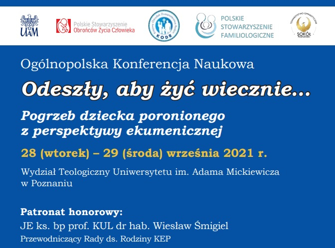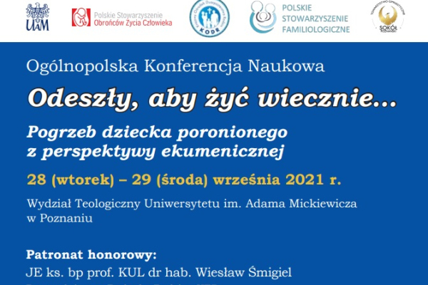 Wydział Teologiczny Uniwersytetu im. Adama Mickiewicza w Poznaniu, Polskie Stowarzyszenie Familiologiczne, Krajowy Ośrodek Duszpasterstwa Rodzin, Polskie Stowarzyszenie Obrońców Życia Człowieka w Krakowie i Towarzystwo Gimnastyczne „Sokół Poznański” zapraszają na Ogólnopolską Konferencję Naukową „Odeszły, aby żyć wiecznie… Pogrzeb dziecka poronionego z perspektywy ekumenicznej”.