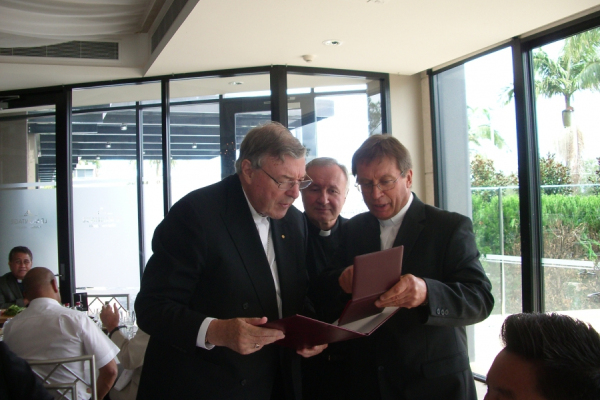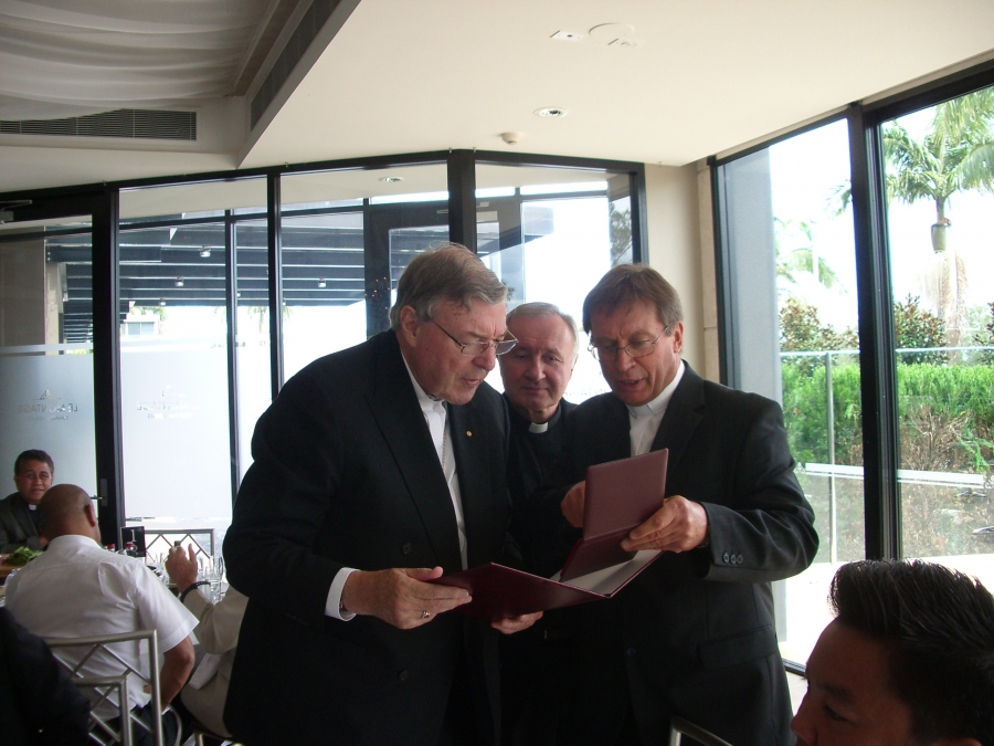 Podczas pożegnalnego spotkania ks. kard. George’a Pella z księżmi na zakończenie jego posługi w Archidiecezji Sydney nasi współbracia ks. Krzysztof Chwałek TChr i ks. Tadeusz Przybylak TChr przekazali Ordynariuszowi w dowoód wdzięczności medal Towarzystwa Chrystusowego ofiarowany przez ks. Generała Ryszarda Głowackiego TChr.