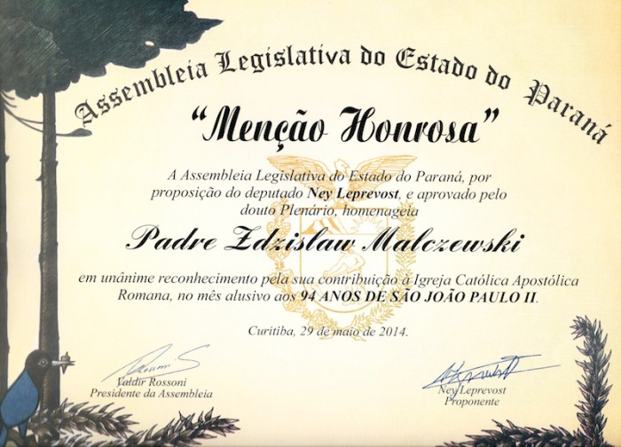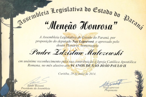 29 maja 2014 r. Parlament stanu Paraná uczcił 94 rocznicę urodzin św. Jana Pawła II. Od kilku lat, na wniosek deputowanego Neya Leprevosta, z okazji urodzin wielkiego Papieża odbywa się uroczysta sesja Parlamentu podczas, której podkreśla się różnorodny wkład Kościoła katolickiego w życiu narodów, a w sposób szczególny narodu brazylijskiego. Na uroczystą sesję Parlamentu zaproszono Arcybiskupa Metropolitę Moacyra Vitti, kilku kapłanów i wiernych Kościoła, których uhonorowano odpowiednimi dyplomami. Wśród wyróżnionych byli przedstawiciele parafii św. Jana Chrzciciela prowadzonej przez chrystusowców oraz PMK w Brazylii.