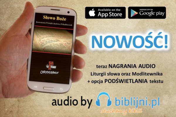 Tworzona przez chrystusowców aplikacja mobilna "Słowo Boże" została wzbogacona o nagrania audio. Dzięki współpracy z portalem Biblijni.pl można teraz odsłuchiwać pozycji zawartych w Liturgii słowa oraz w Modlitewniku. Dołączona została także opcja podświetlania zaznaczonego tekstu. Zapraszamy do uaktualnienia aplikacji i korzystania z nowych funkcji. Adres strony aplikacji: http://tchr.us/app_site/