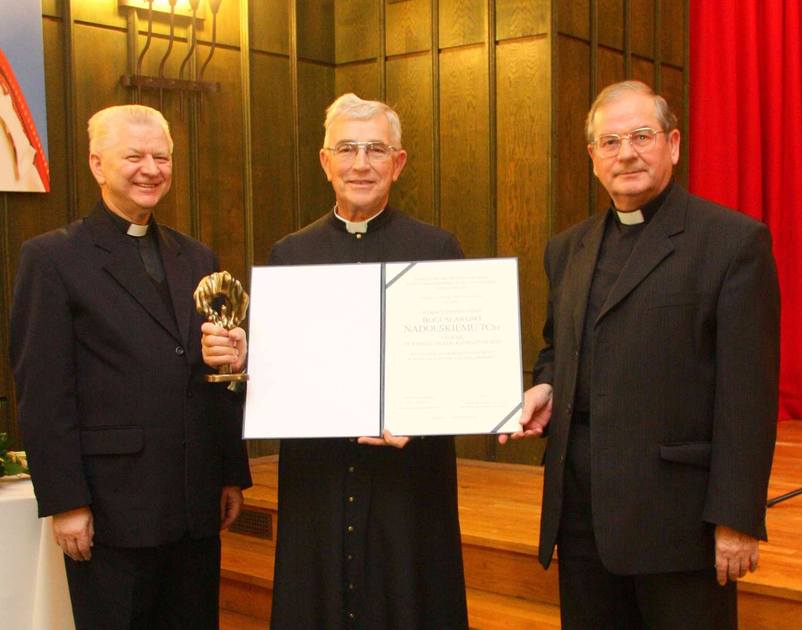 Po laudacji obydwaj goście z lubelskiej uczelni wręczyli Nagrodę w postaci statuetki i dyplomu, po czym głos zabrał laureat ks. prof. Bogusław Nadolski. Mówił, że bardzo ucieszyła go ta nagroda i jeszcze bardziej zmobilizowała do pracy, czego efektem będzie kolejna książka, która na dniach się ukaże. Ks. Nadolski dziękował także wszystkim, którzy go wspierali i pomagali na różny sposób w jego karierze naukowej. Szczególne podziękowania skierował do współbraci chrystusowców - księży prowincjałów i innych szczególnie tych pracujących za granicą. Podkreślił, że dzięki ich życzliwości i pomocy miał możliwość poznać wiele zachodnich ośrodków naukowych, a także wzbogacić swoją liturgiczną bibliotekę w książki w Polsce właściwie nieosiągalne.
