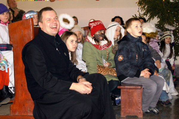 Wspólne przeżywanie podsumowania akcji kolędników misyjnych rozpoczęliśmy Mszą Świętą, której przewodniczył ks. Franck Mbida z Kamerunu – od pewnego czasu pracujący w archidiecezji szczecińsko-kamieńskiej. On także wygłosił homilię. Ksiądz Franck szczególnie podkreślał dziecięcą wrażliwość na świat, którego nie znają. Przypomniał o Sudanie Południowym – jednym z najbiedniejszych państw świata, najmłodszym, bo liczącym sobie zaledwie pół roku, na którym skoncentrowana była tegoroczna akcja Kolędników Misyjnych.