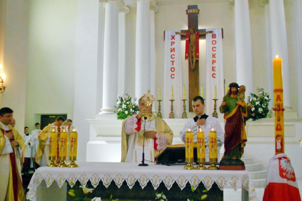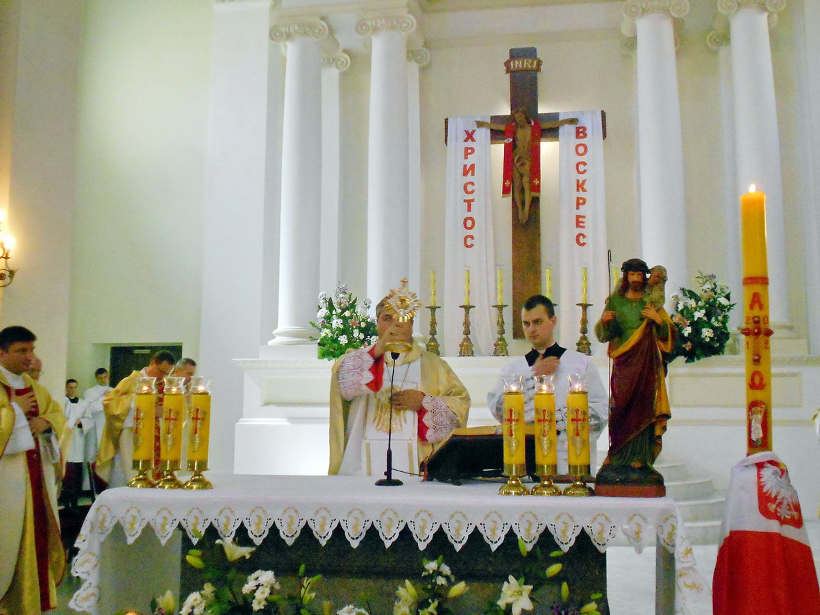 Biało-czerwono i „majowo” było 29 kwietnia 2012 r. w katedrze pw. św. Aleksandra w Kijowie. W niedzielę Dobrego Pasterza celebrowano tutaj liturgię z okazji pierwszej rocznicy beatyfikacji Jana Pawła II oraz uroczystości NMP Królowej Polski. Do stołecznej świątyni przybyli z tej okazji: JE Ambasador RP na Ukrainie Henryk Litwin z Rodziną, przedstawiciele polskiego korpusu dyplomatycznego, działacze polonijni z Kijowa, Żytomierza, Białej Cerkwi i Różyna, pielgrzymi z Lubaczowa, działacze NSZZ „Solidarność” z Rzeszowa, grupa ministrantów z parafii chrystusowców w Poznaniu oraz niezwykle liczna grupa miejscowych katolików. Mszę świętą celebrował ordynariusz diecezji Kijowsko-Żytomierskiej ks. abp Piotr Malczuk wraz z kapłanami, którzy wraz z pielgrzymami przybyli z Polski. Ksiądz Arcybiskup wygłosił także homilię. Pod koniec Mszy Świętej głos zabrał Ambasador RP na Ukrainie Henryk Litwin.